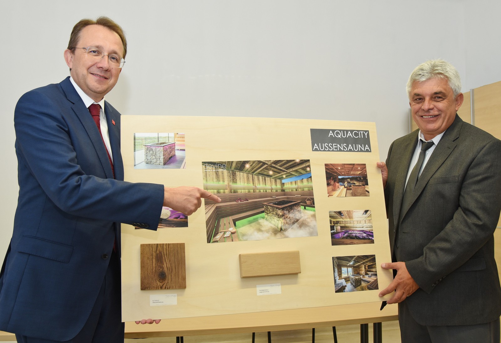 Bürgermeister Mag. Matthias Stadler und Leiter der Bäderverwaltung Martin Fuchs freuen sich über eine positive Bilanz und verweisen auf den Start der Saunasaison.