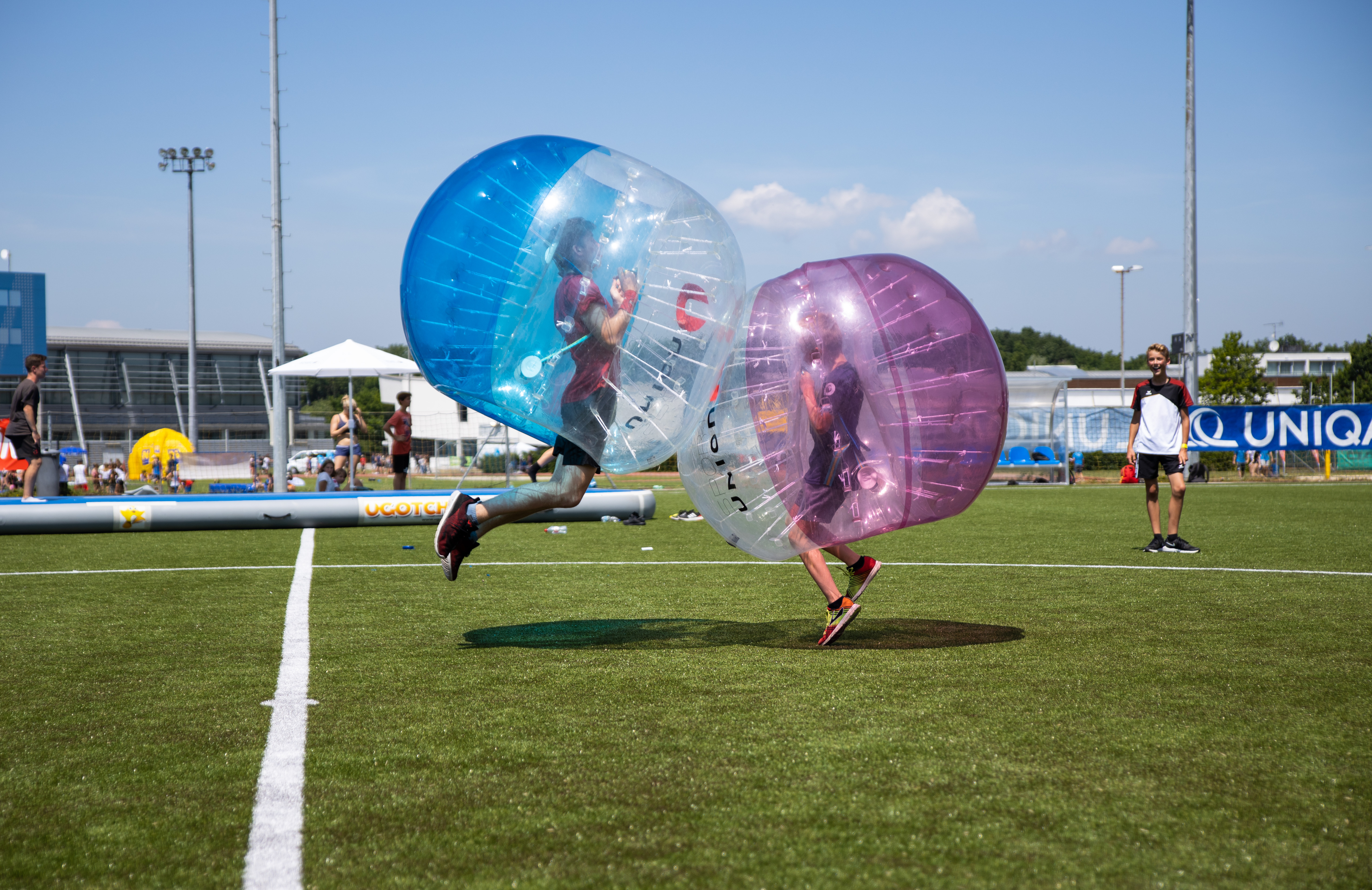 zwei Jugendliche hüpfen geschützt durch einen aufgeblasenen Ganzkörperball aufeinander zu (Foto: Andreas Simon)