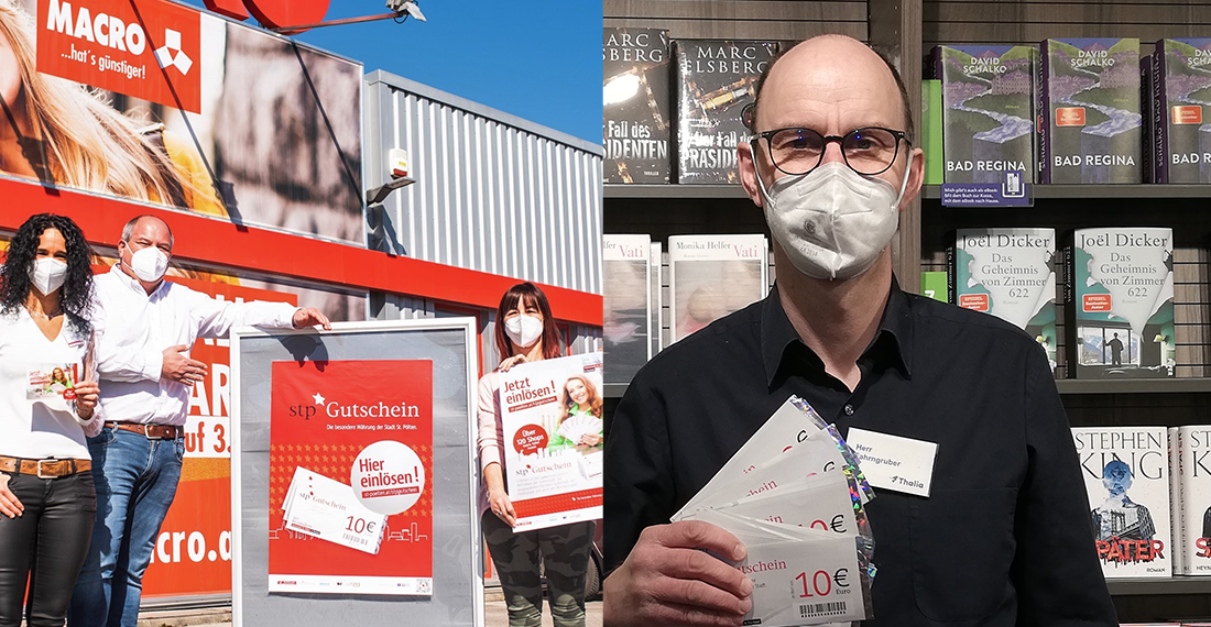 Die stp*Gutscheine sind nicht nur in der Innenstadt beliebtes Zahlungsmittel, sondern auch bei ausgewählten Partnern rundherum. Und sie sind nützlich in der Bücherwelt von Thalia in der Kremser Gasse genau so wie im Großhandel bei Macro am Kollerbergweg.