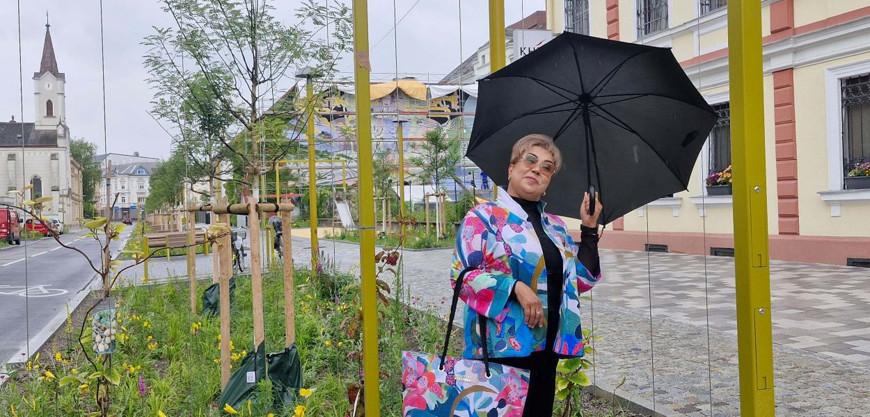 Shaima im fröhlichen Blazer bei trübem Wetter am blühenden neuen Promenadenring. Foto: Rlebnisreich