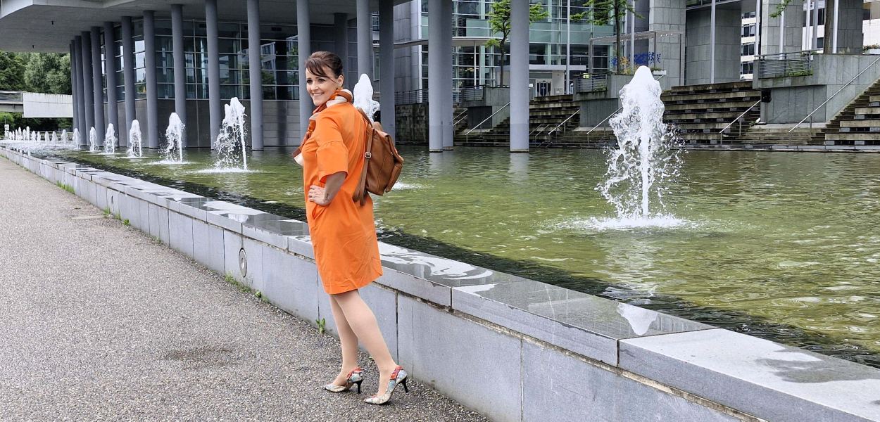 Fürs Fotoshooting wurde Jasmina von Jones eingekleidet. Jones-Lady Evelyn Humhal hatte für Jasmina ein strahlend oranges, sommerliches Ensemble gewählt, aus dem fröhlich bunten Angebot des Shops am Riemerplatz. Gerda Jaeggi vom Fotoclub ESV hat fotografiert, bei der Jones-Boutique, beim Passauer Wolf und im Regierungsviertel.