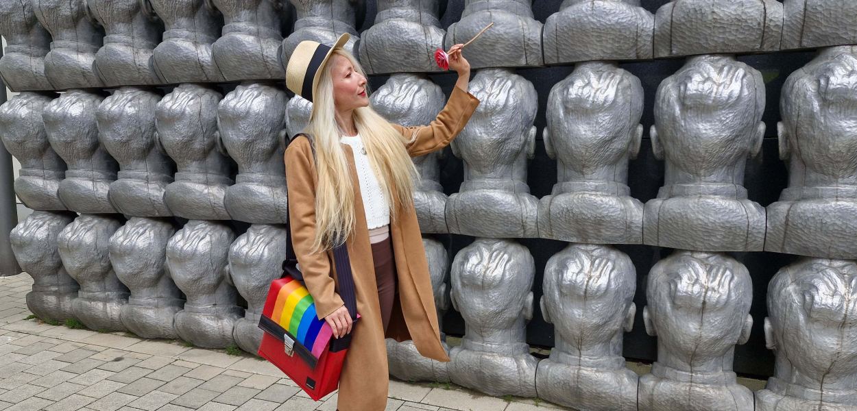 Eileen mit ihrer Regenbogen-Tasche von Gabarage im Regierungsviertel. Foto: Rlebnisreich