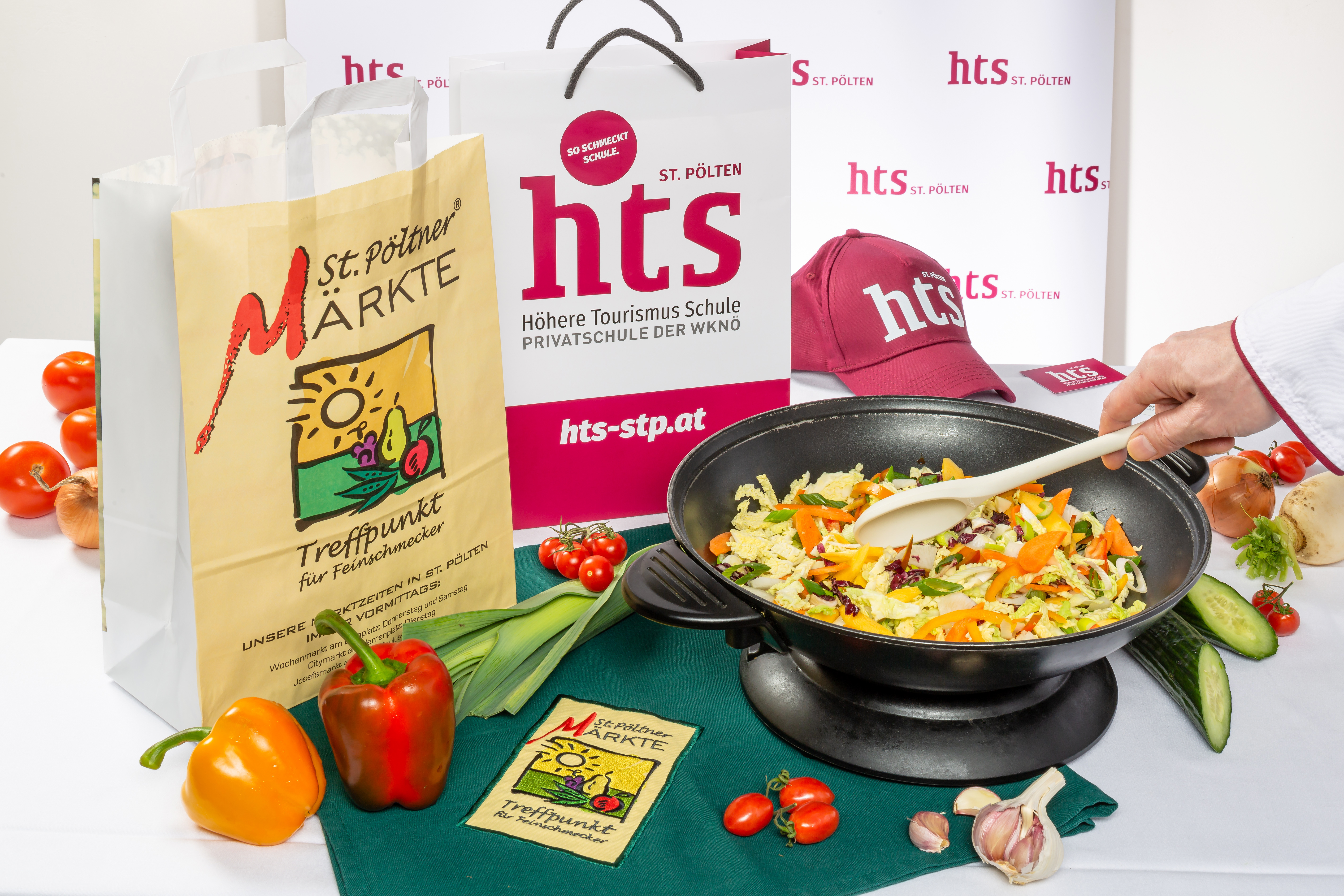 Die Schüler:innen der Höheren Tourismusschule St. Pölten (HTS) zeigen am Donnerstag, dem 15. Mai 2025 am Wochenmarkt ihre Künste und bereiten Schmankerl mit regionalen Produkten des Marktes zu.