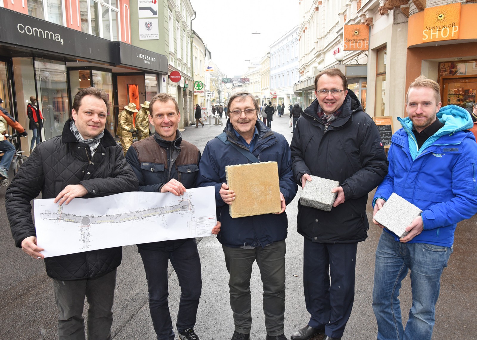 Zur benutzer- und rollstuhlfahrerfreundlichen Herstellung einer möglichst ebenen Oberfläche kommen nur geschnittene und gestrahlte Materialien zur Anwendung. „Unser Ziel ist es, für die RollstuhlfahrerInnen eine möglichste ebene Oberfläche herzustellen mit dem positiven Nebeneffekt, dass die neue Pflasterung stöckelschuhtauglich sein wird“, sagt der Leiter des Fachbereichs Bau im Magistrat DI Kurt Rameis.