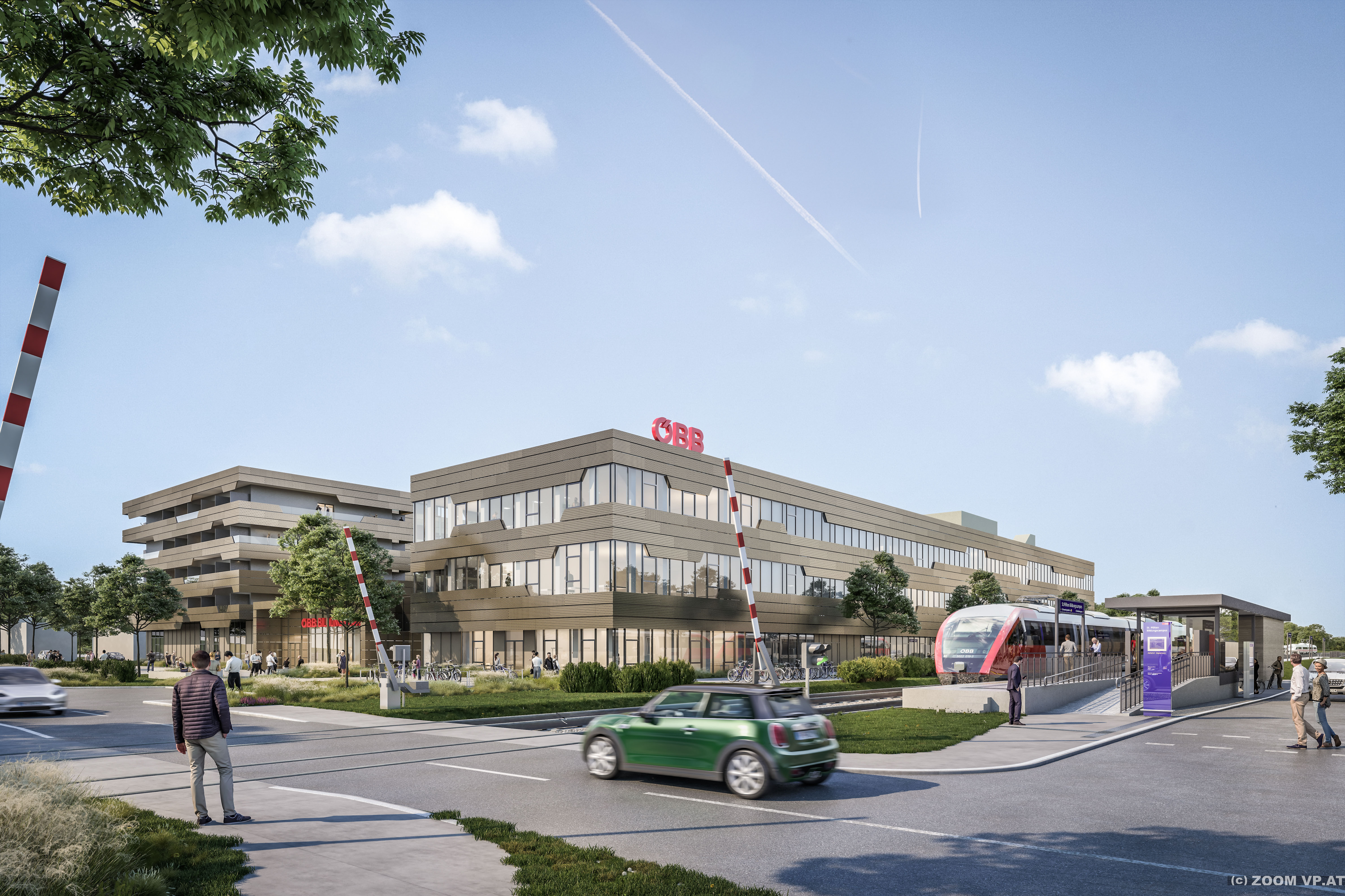 Zuletzt werden die Außenanlagen mit dem parkähnlichen Eingangsbereich, den KFZ- und Radabstellflächen sowie den Übungsgleisanlagen errichtet.
