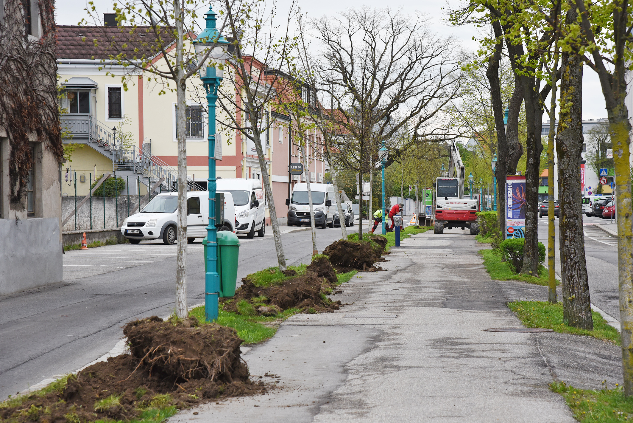 Die Profis der Stadtgärtnerei sind seit den frühen Morgenstunden damit beschäftigt, vorsichtig auf einem 200 Meter langen Abschnitt alle gesunden Bäume auszugraben, damit diese sich auf die Reise machen können. Beim Spielplatz in der Weyprechtstraße werden über 20 Jungbäume ihr neues Zuhause finden: Dort werden sie demnächst nämlich wieder eingepflanzt.
