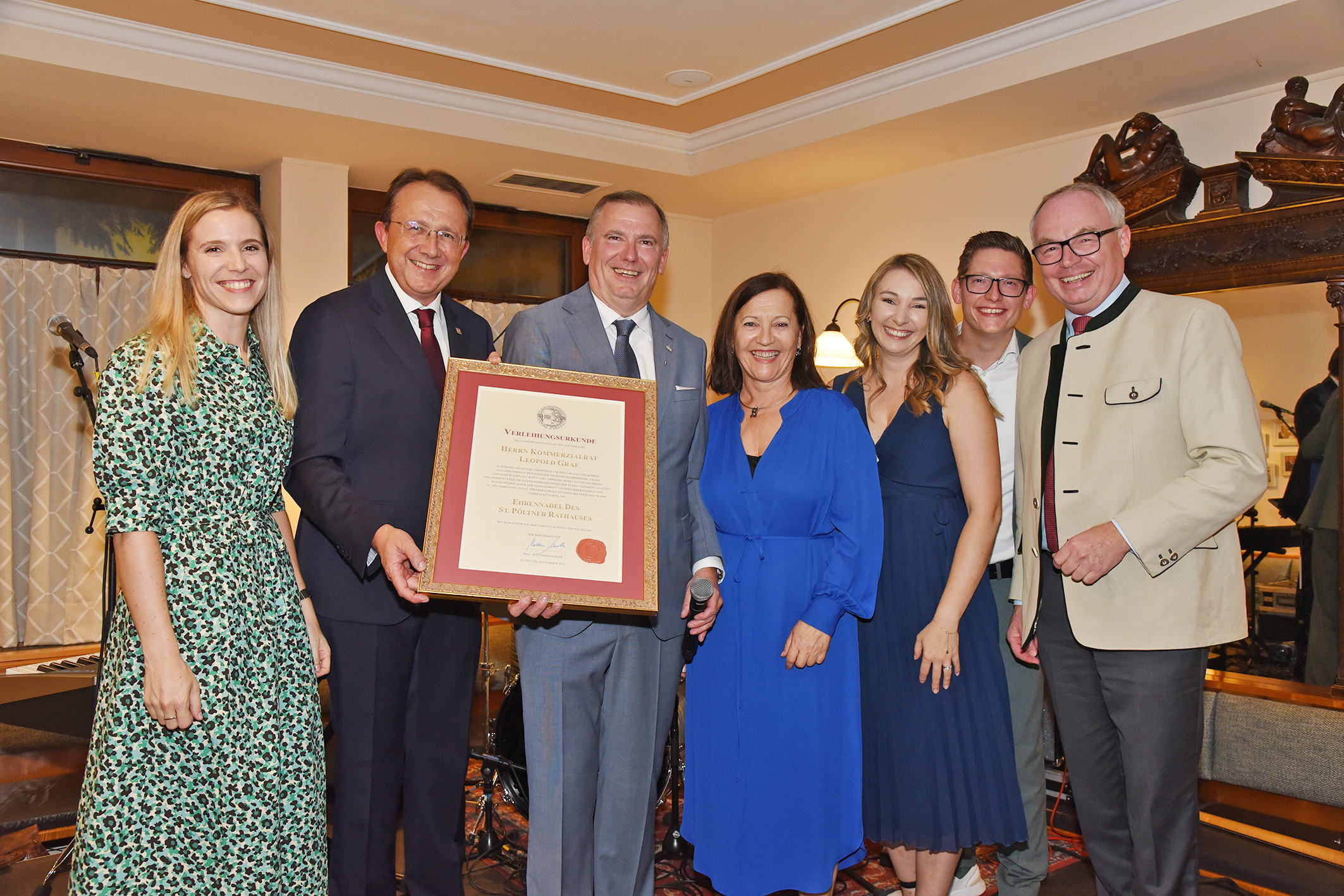 „Er ist schon ein tolles Zeichen der Wertschätzung und Anerkennung“, freut sich Leo Graf ob der Auszeichnung. Zumal erfolgreiche Unternehmensführung allein ja nicht zur Verleihung dieses Berufstitels führt. Die Träger des Titels müssen auch etwas für die Allgemeinheit geleistet haben. Und da steht Leo Graf immer wieder in der ersten Reihe. So wurde ihm im Rahmen der Feierlichkeiten anlässlich des 70-jährigen Jubiläums von Bürgermeister Matthias Stadler die Ehrennadel des St. Pöltner Rathauses überreicht, um seine Verdienste um den lokalen Tourismus zu würdigen.
