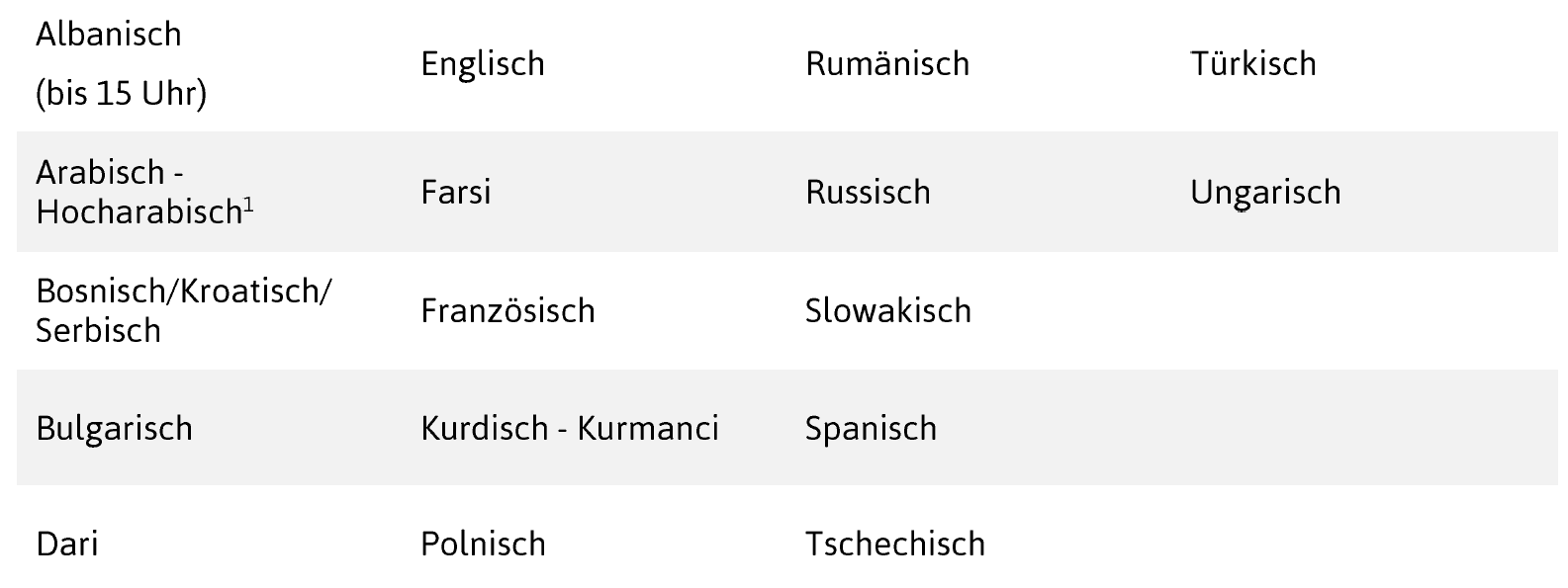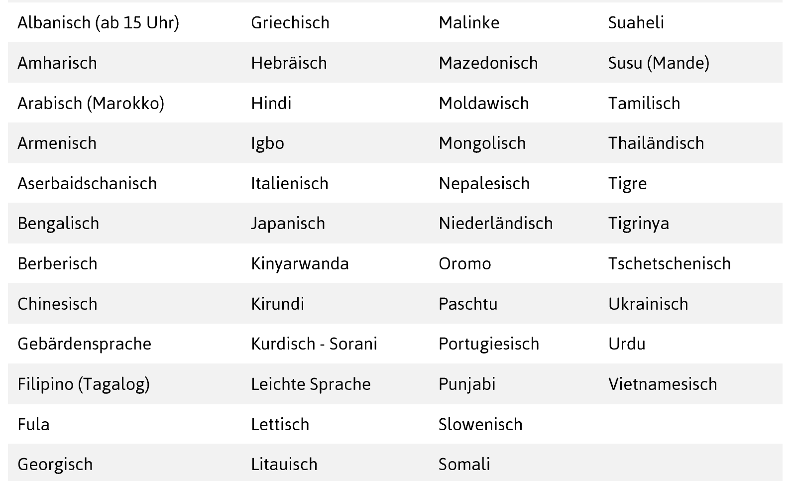 17 sogenannte Ad-hoc-Sprachen werden angeboten, bei diesen Sprachen stehen innerhalb von fünf Minuten Dolmetscher:innen zur Verfügung. Außerdem bietet das System 46 weiter Sprachen an, für die jedoch eine Terminvereinbarung notwendig ist. Und auch für die Gebärdensprache stehen nach Terminvereinbarung Dolmetscher:innen bereit.