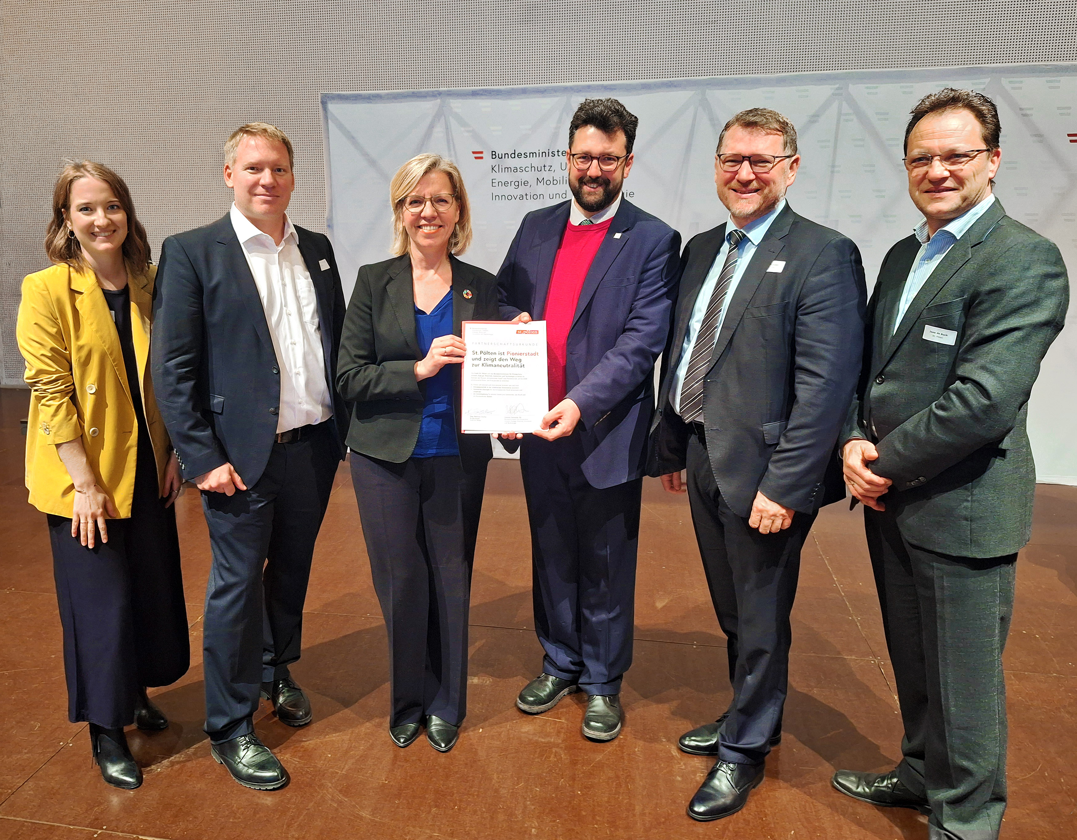 „Heute haben wir einen besonders symbolträchtigen Schritt auf dem Weg zur Klimaneutralität gesetzt. Zehn Großstädte haben sich offiziell dazu bekannt, mit gutem Beispiel voranzugehen und sich dabei gegenseitig tatkräftig zu unterstützen“, erklärt Klimaschutzministerin Leonore Gewessler gleich nach der Unterzeichnung der Urkunde mit Vizebürgermeister Harald Ludwig. Der vertrat Bürgermeister Matthias Stadler bei einer offiziellen Partnerschaftsbekundung im Ankersaal in Wien. Im Rahmen der Mission „Klimaneutrale Stadt“ wollen neben St. Pölten auch Wien, Graz, Innsbruck, Klagenfurt, Villach, Linz, Salzburg, Dornbirn und Wiener Neustadt aufzeigen, wie eine ressourcenschonende Wirtschafts- und Lebensweise in der Praxis umsetzbar ist. Das Klimaschutzministerium (BMK) unterstützt sie in Kooperation mit dem Klima- und Energiefonds dabei, durch Forschung und Entwicklung schneller klimaneutral zu werden.