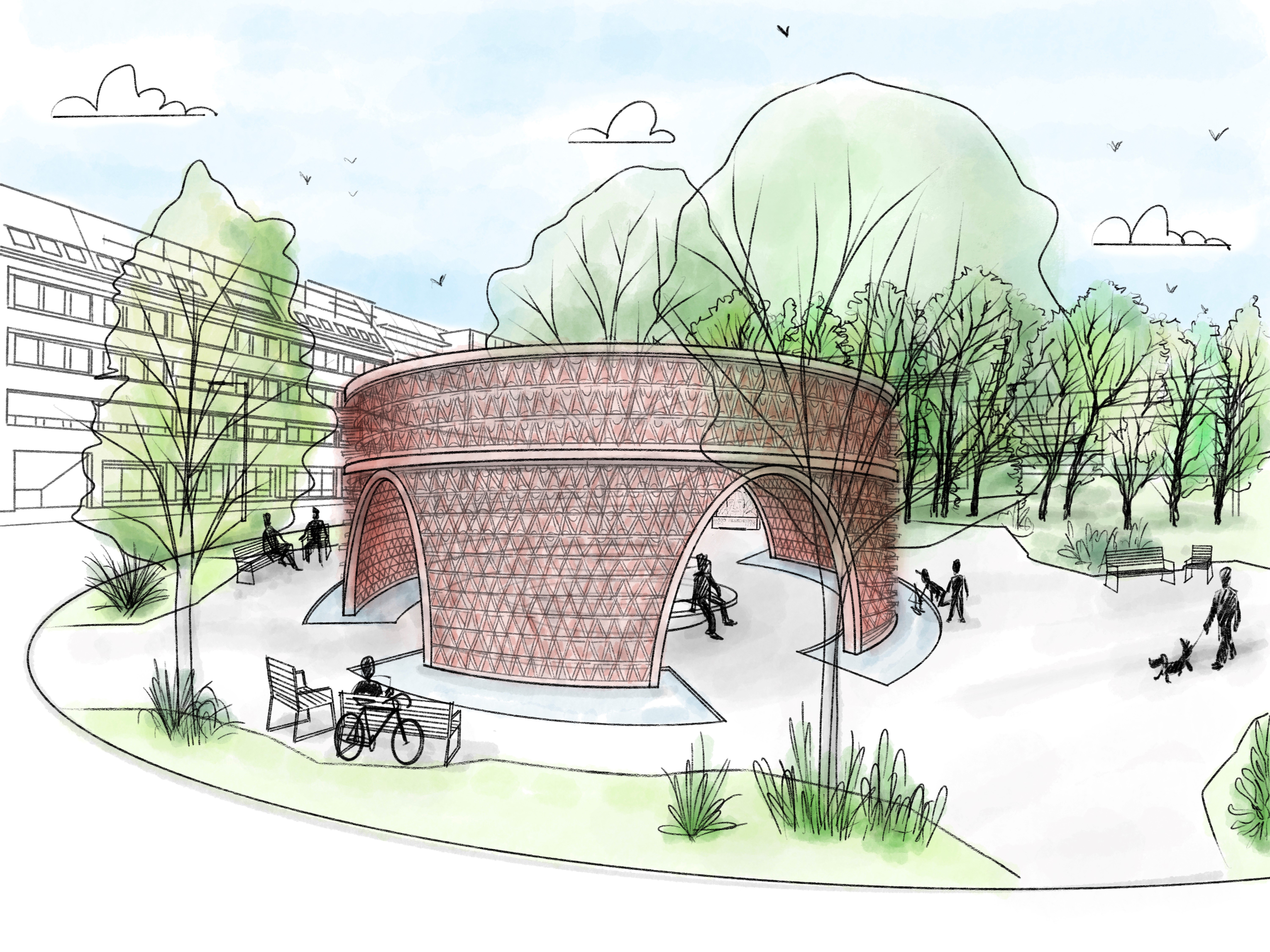 Ein bewusster Gegenpol zu dem meistbefahrenen Verkehrsknotenpunkt St. Pöltens: Die kreisförmige Brunnenskulptur des Künstler:innen-Verbunds „Breathe Earth Collective“ wird schon bald als neues grünes Tor zur verkehrsberuhigten Innenstadt wirken. Mit speziellen Ziegelformen und einem Bewässerungssystem erzeugt der Windfänger einen luft- und lichtdurchlässigen Raum, der Nistplätze für Vögel und Insekten schafft sowie Verkehrslärm und Feinstaub entgegenwirkt. In und um die Skulptur herum werden Bäume und Bänke zum Verweilen einladen.