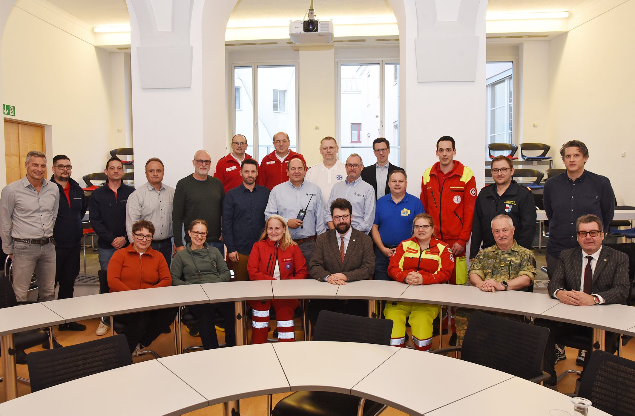 Arbeiter-Samariter-Bund, Rotes Kreuz, Wasserrettung, Polizei, Bundesheer, Feuerwehr, Zivilschutz-Verband und Stadt trafen sich zum Austausch im Rathaus. (Foto: Josef Vorlaufer)
