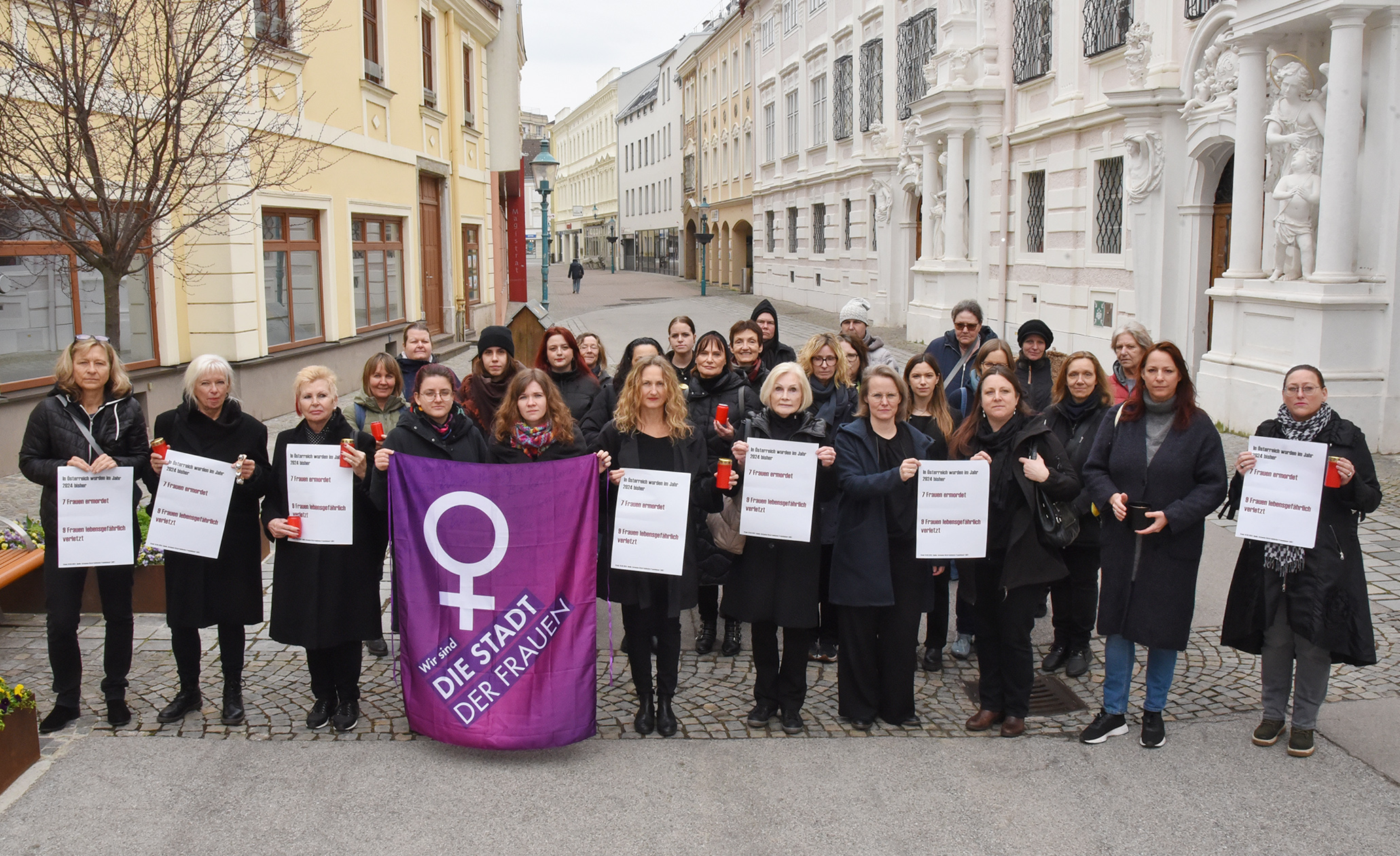 Das Büro für Diversität St. Pölten schloss sich der Aktion an und veranstaltete eine Kundgebung am Frauenplatz. „Österreich verliert jährlich zahlreiche Frauen durch Männergewalt. Ein unerträglicher Zustand, den wir nicht mehr dulden können und wollen“, so Martina Eigelsreiter, Leiterin des Büros für Diversität St. Pölten. Bei der Trauer- und Protest-Aktion am 1. März wurde auch in St. Pölten den sieben Femiziden und neun Mordversuchen (Quelle: Autonome Österreichische Frauenhäuser – AÖF, Stand: 1.3.2024) im heurigen Jahr gedacht. 2023 gab es insgesamt 15.000 Betretungs- und Annäherungsverbote – das sind 15.000 vorhergegangene Gewalttaten und Bedrohungen meist gegen Frauen und Kinder.