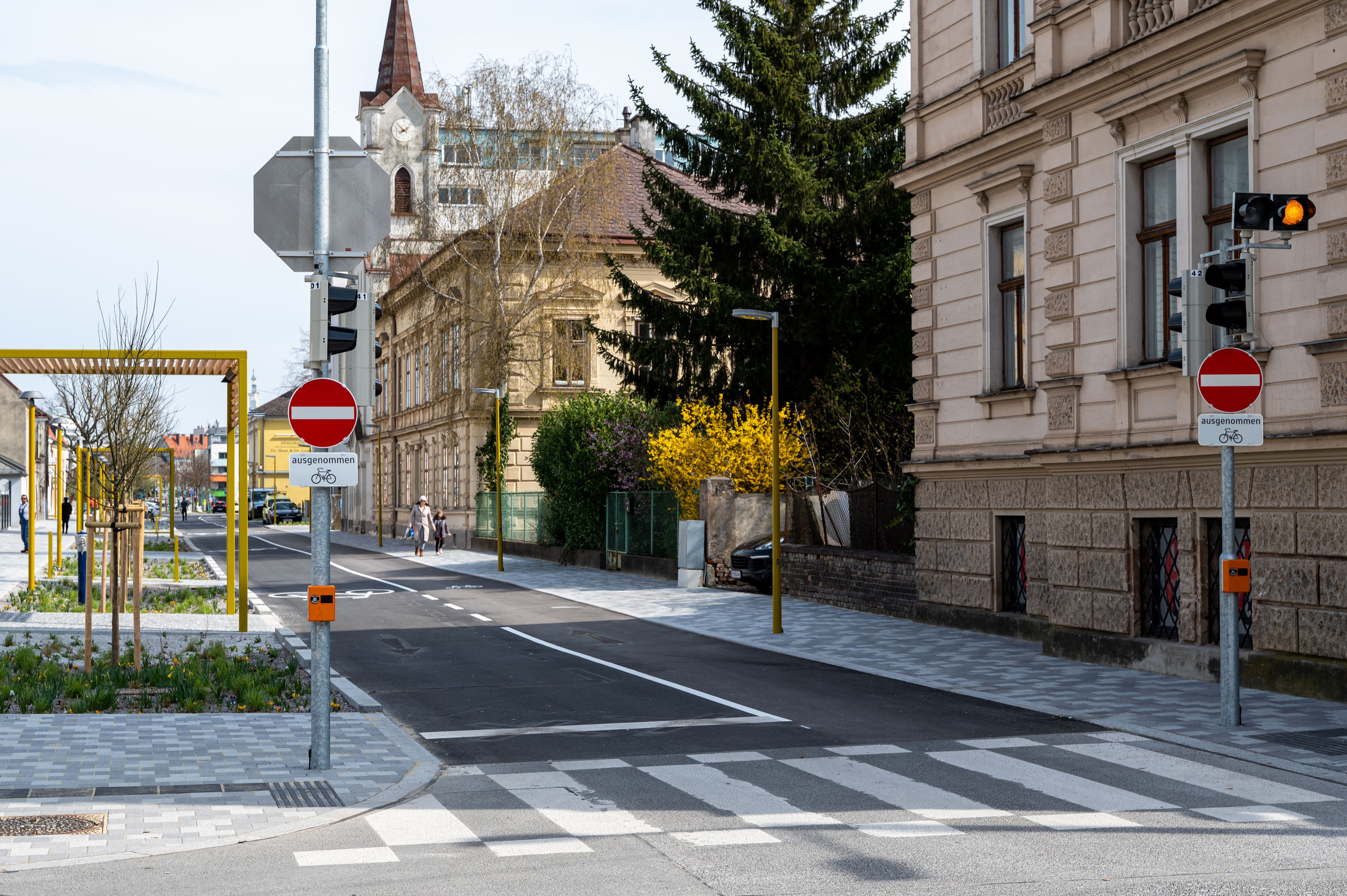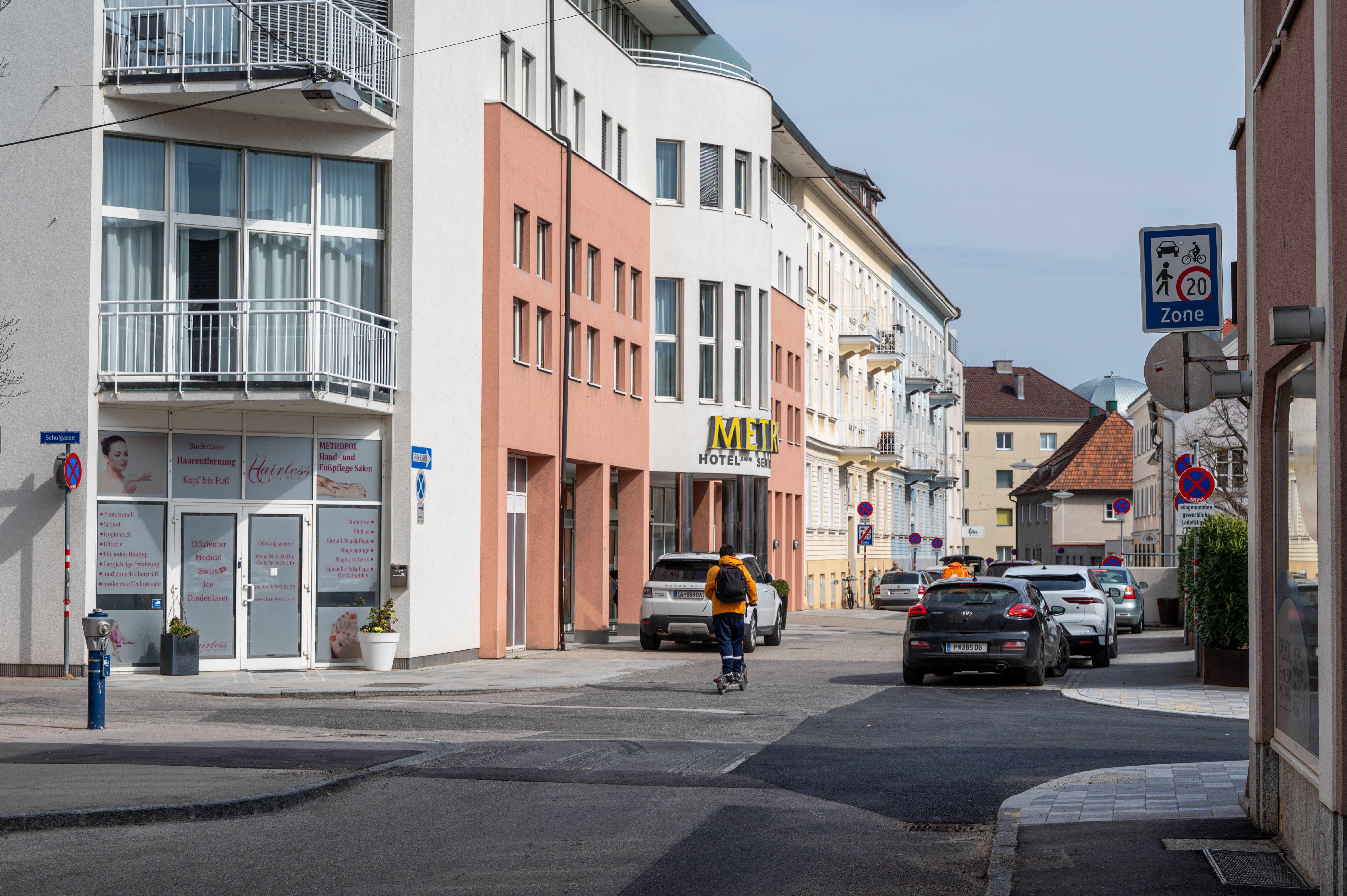 Die bestehende Begegnungszone in der Schulgasse wurde Richtung Süden ausgeweitet. Sie erstreckt sich ab sofort bis über die Kreuzung der Dr. Karl Renner-Promenade mit der Schulgasse sowie über den Bereich vor dem Hotel Metropol.