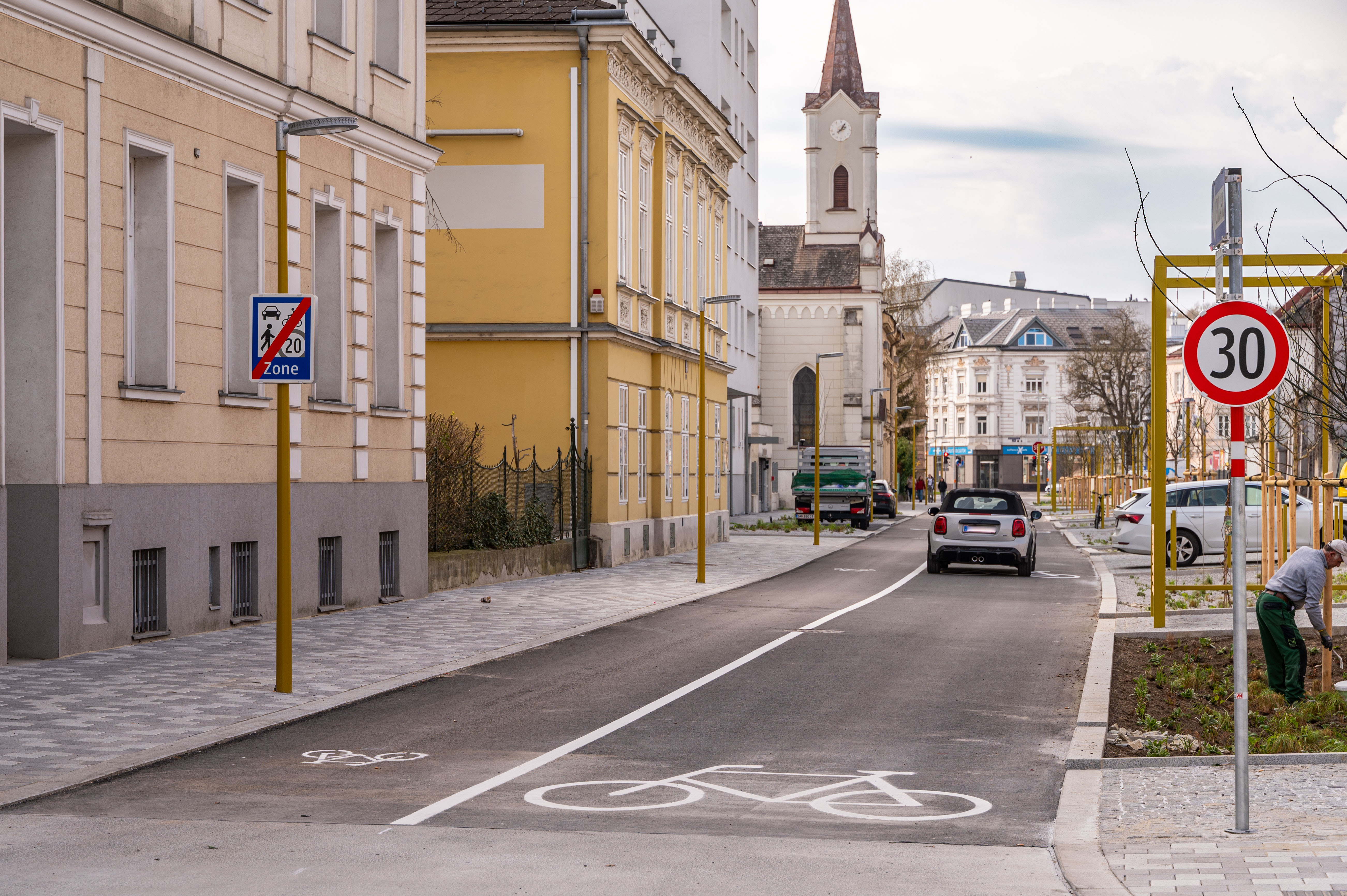 In der Begegnungszone gilt eine Höchstgeschwindigkeit von 20 km/h. Fußgänger:innen dürfen die gesamte Fahrbahn benützen.
