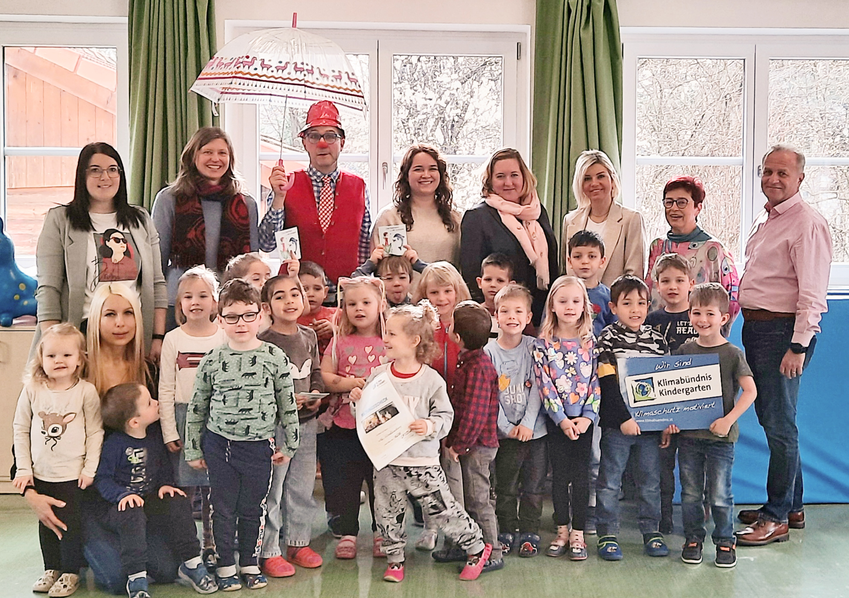 Anlässlich der Klimabündnis-Beitritte des Kindergartens Schnoflsiedlung am 11. März sowie der Volksschulen Radlberg und Viehofen am 22. März, war ein Clown-Theater zu Besuch. Bürgermeister Matthias Stadler, Umweltgemeinderätin Renate Gamsjäger und Schulamtsleiter Andreas Schmidt sowie Tatjana Fischer und Lena Kranawetter vom Referat für Umweltschutz freuen sich über den Zuwachs und unterstützen beide Bildungseinrichtungen mit einem Klimabündnis-Bildungsscheck.