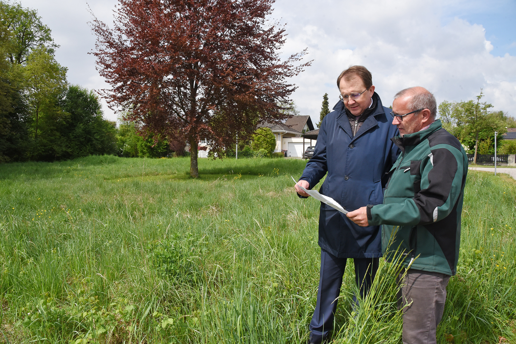Bürgermeister Matthias Stadler und Stadtgärtner Robert Wotapek besprechen vor Ort die Pläne für den neuen Spielplatz in Pottenbrunn. (Foto: Vorlaufer)