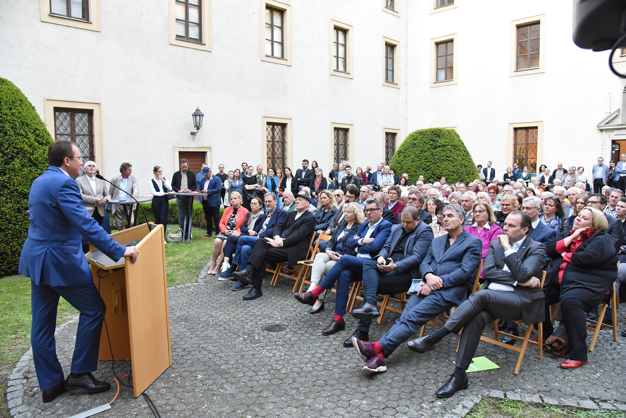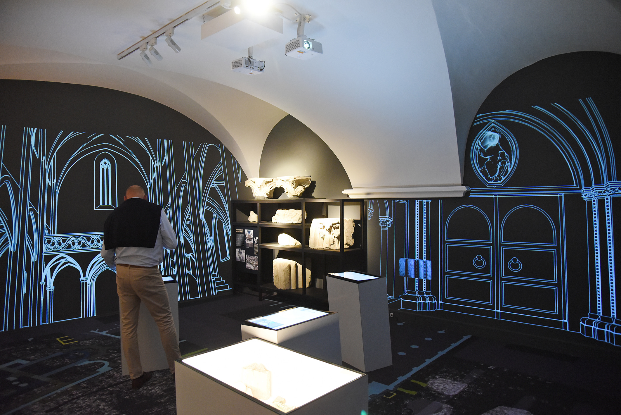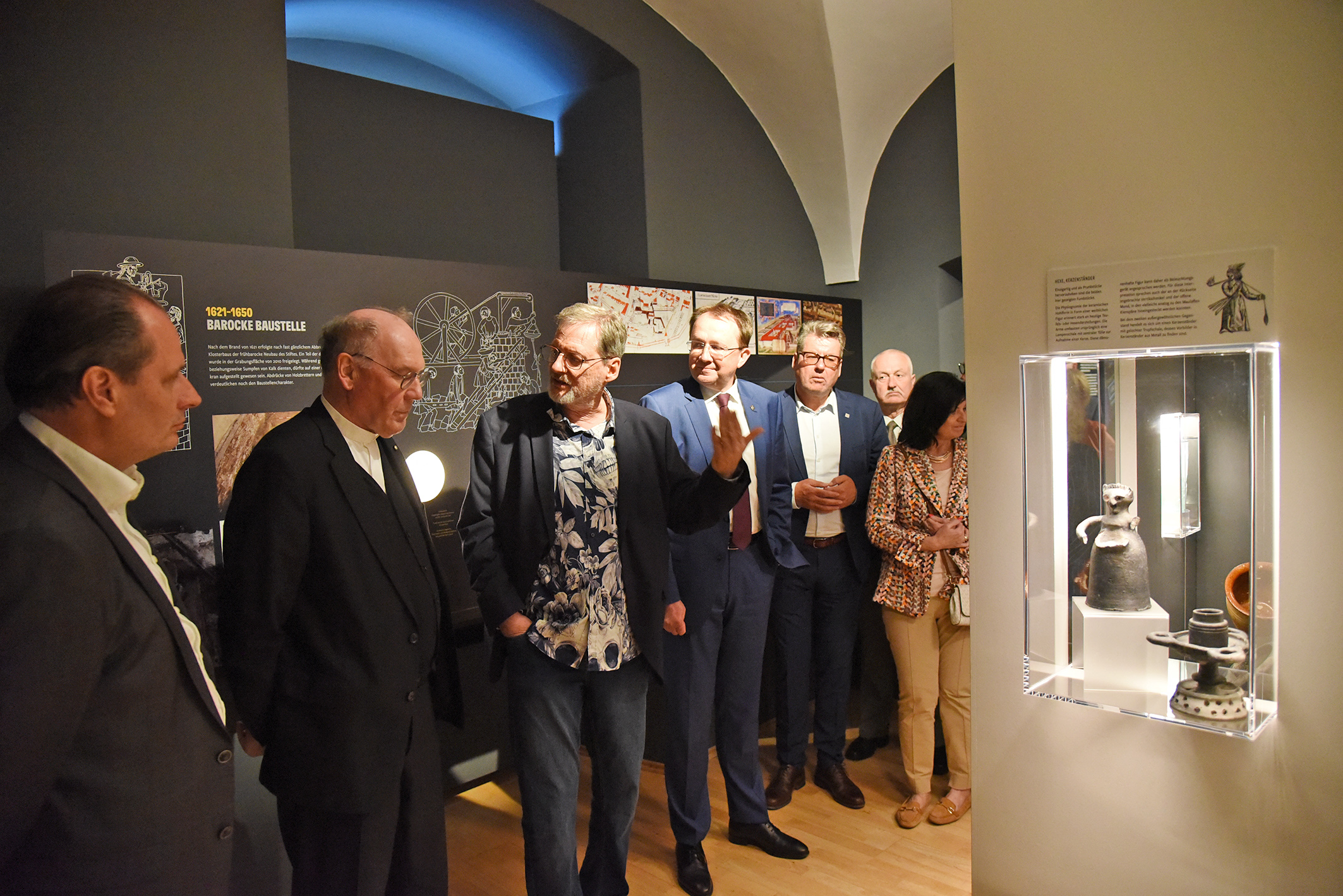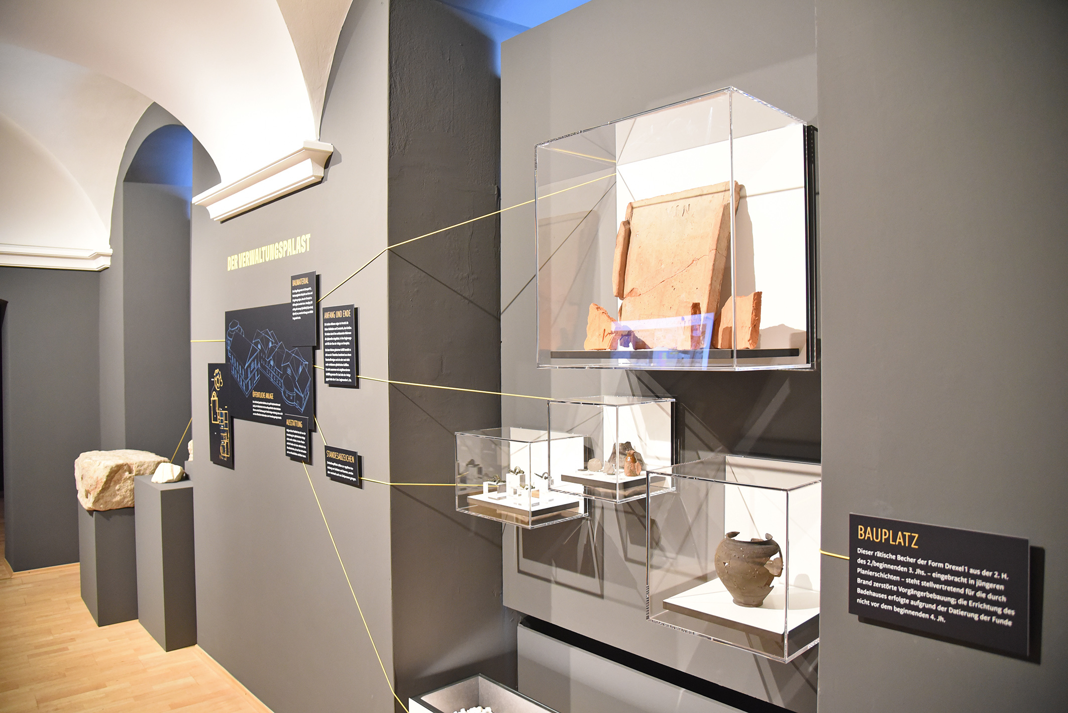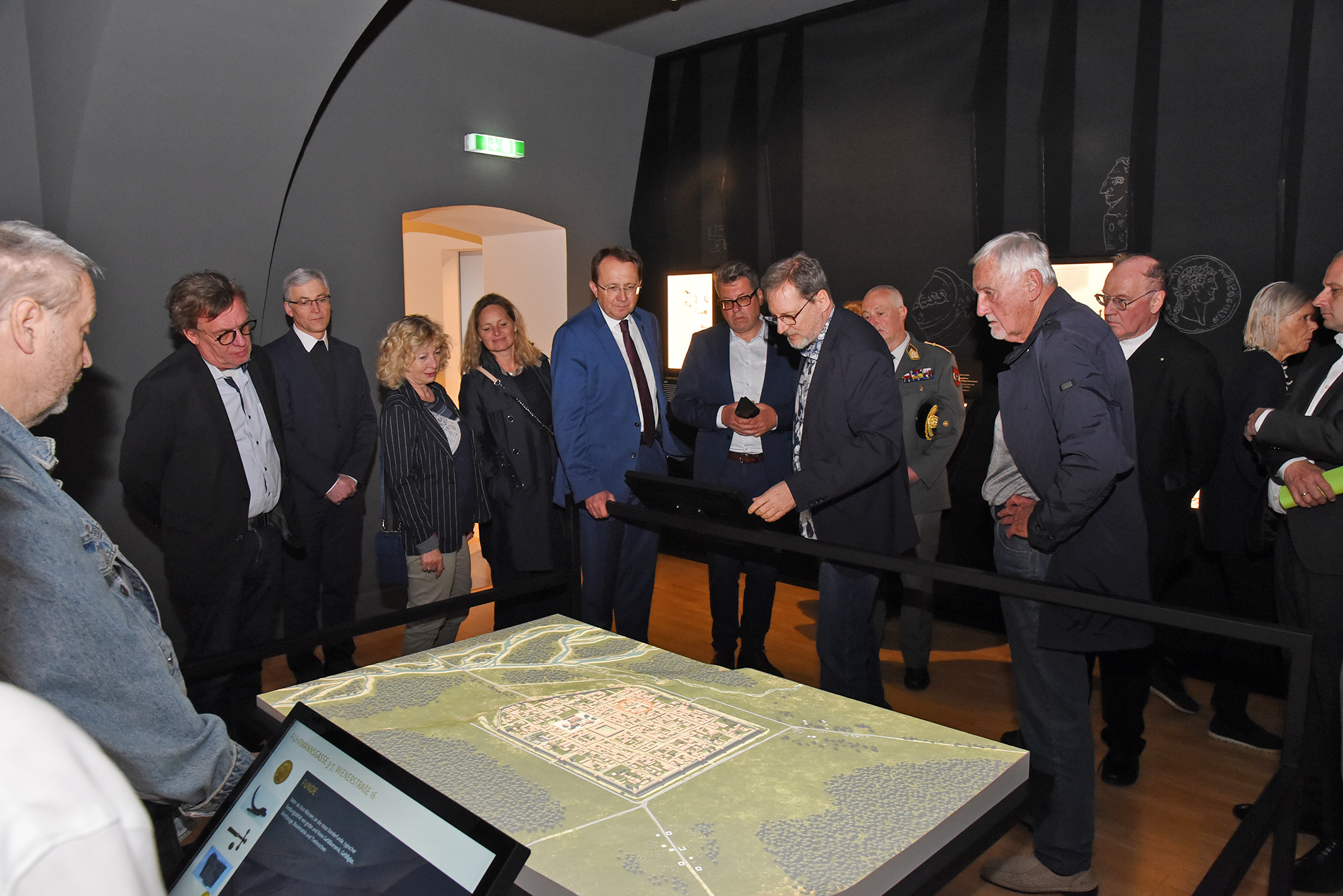 Fast 300 Gäste ließen sich die Eröffnung der Ausstellung im malerischen Innenhof des Stadtmuseums nicht entgehen. Die zehn Jahre dauernden archäologischen Grabungen haben sensationelle Ergebnisse zutage gebracht, wie Stadtarchäologe und Kurator Ronald Risy erklärte. Wie aus dem Titel „Von Steinen und Beinen” bereits hervorgeht, ist die Ausstellung des Stadtarchäologen Ronald Risy zweigeteilt. Über Zeitportale werden die Besucher:innen zum ersten Teil der Ausstellung geführt, der sich „den Steinen“, also den aufgedeckten Mauerresten widmet.