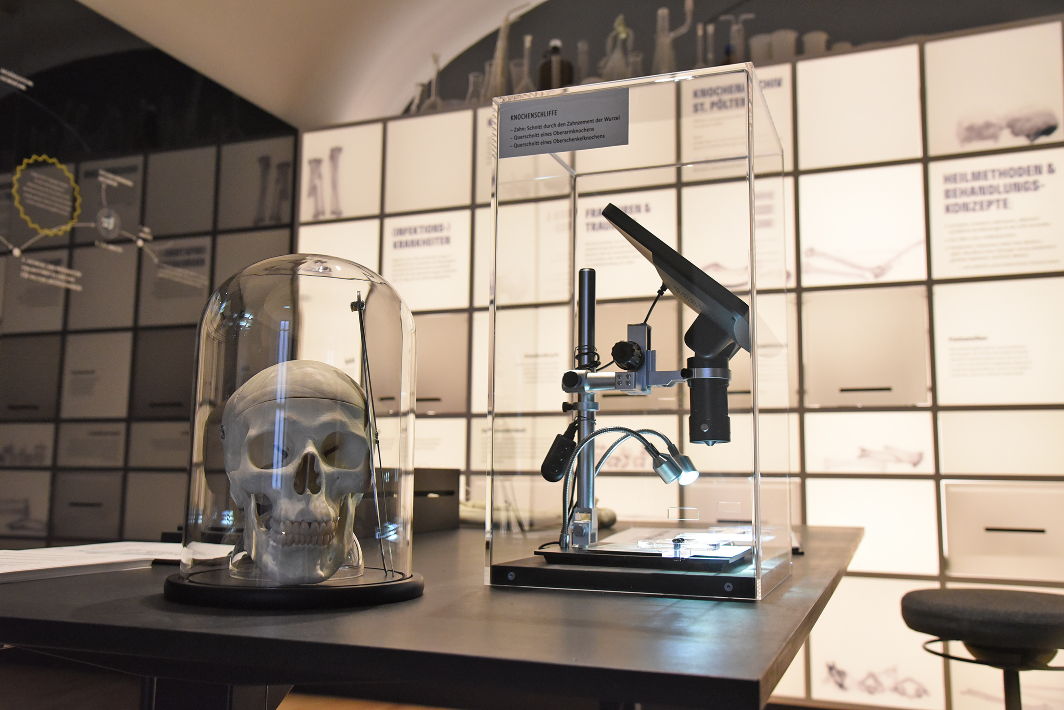 Präsentiert werden in diesem Teil der Ausstellung nicht nur Originalfunde vom Domplatz, sondern auch erstmals die aufsehenerregenden Resultate der naturwissenschaftlichen Untersuchungen, die einen tiefen Einblick in die Lebensbedingungen der St. Pöltner Bevölkerung in früheren Zeiten geben. Das Leben von früher erzählt von diversen Begräbnisritualen sowie tiefer Religiosität, aber auch von Aberglauben und der Angst vor Widergängern oder Nachzehrern.