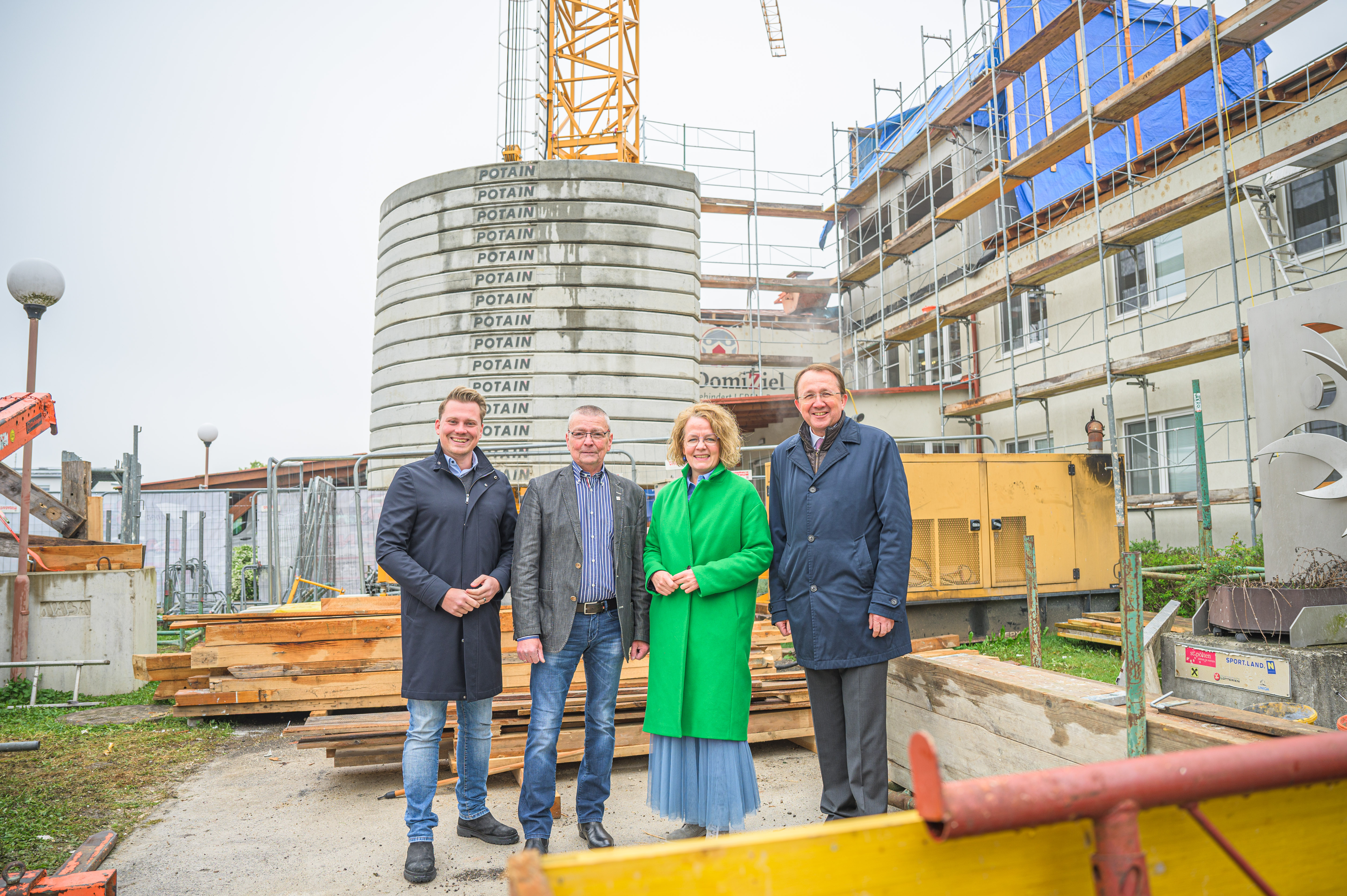Bürgermeister Matthias Stadler und Landesrätin Christiane Teschl-Hofmeister sowie DomiZiel-Obmann Stadtrat Dietmar Fenz und Landtagsabgeordneter Florian Krumböck überzeugten sich vom Baufortschritt in Spratzern. (Foto: Kalteis)