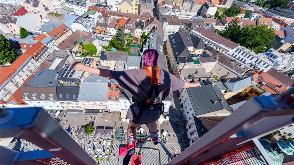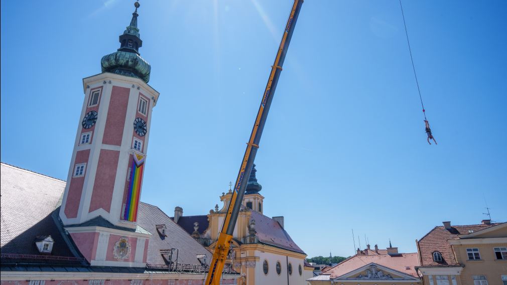 Direkt im Herzen der Innenstadt St. Pölten geht es ganze 65 Meter ab in die Tiefe: Beim Glocken-Bungy-Jumping am Donnerstag, den 20. Juni 2025, springen mutige Menschen vom Kran auf dem Rathausplatz ab - aus 15 Metern Höhe über dem 60 Meter hohen Rathaus-Turm! Keine Lust auf den Sprung ganz allein? Keine Panik: Neben sprungbereiten Solo-Artists werden natürlich auch Tandem-Springer:innen gefeatured!