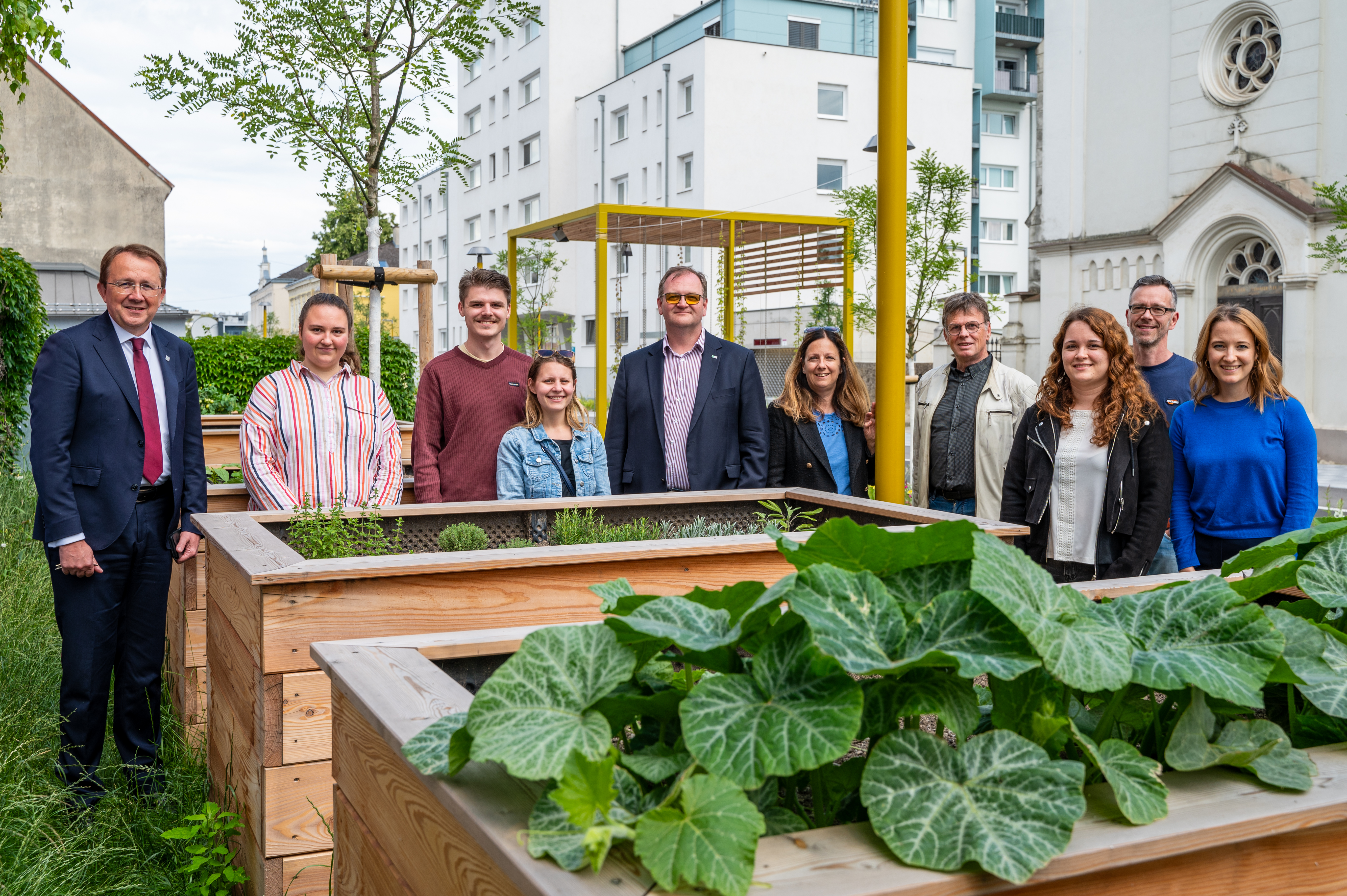 Ein Gruppenfoto der neuen Pat:innen gemeinsam mit Bürgermeister Matthias Stadler bei den neuen Hochbeeten am Promenadenring. (Foto: Christian Krückel)