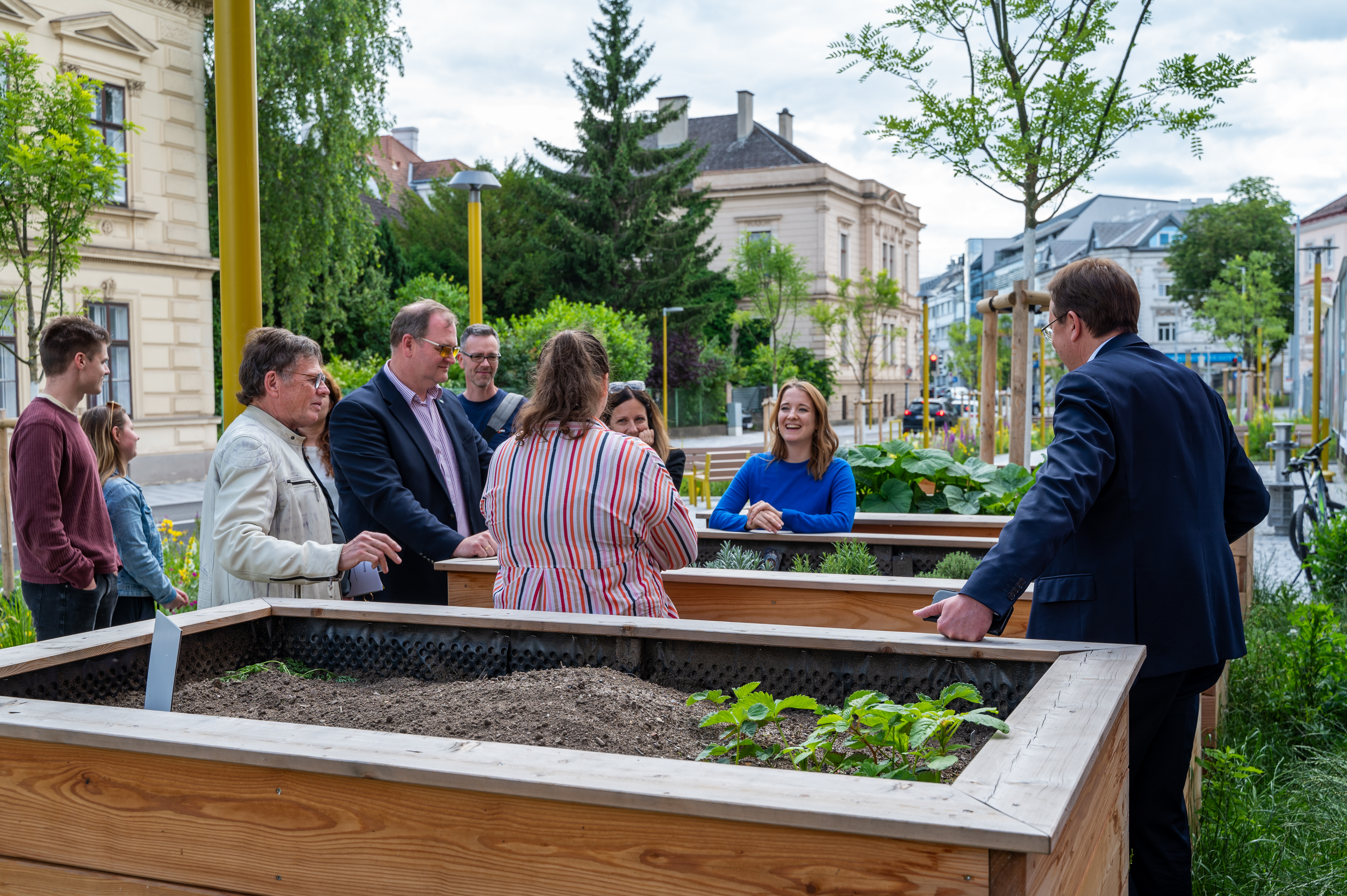Bei der Übergabe der Hochbeete am Promenadenring mit Bürgermeister Matthias Stadler konnten sich die neuen Verwalter:innen direkt untereinander vernetzen. (Foto: Christian Krückel)