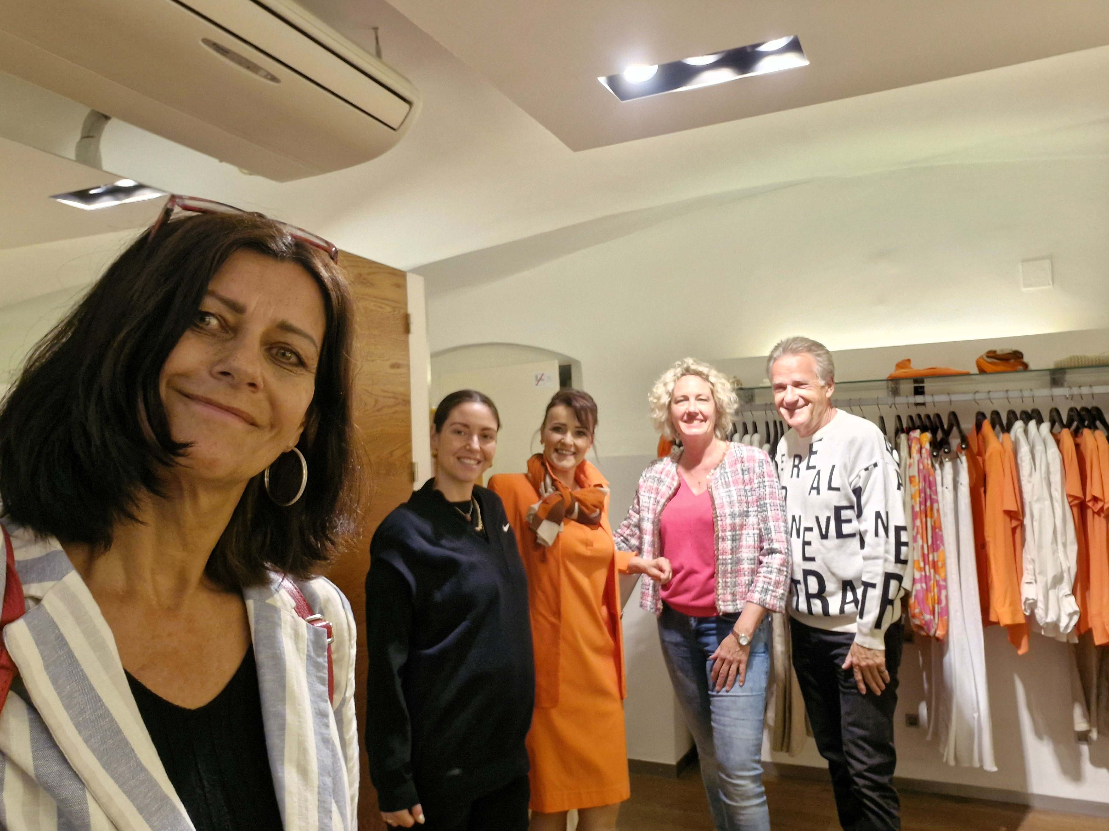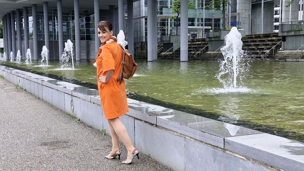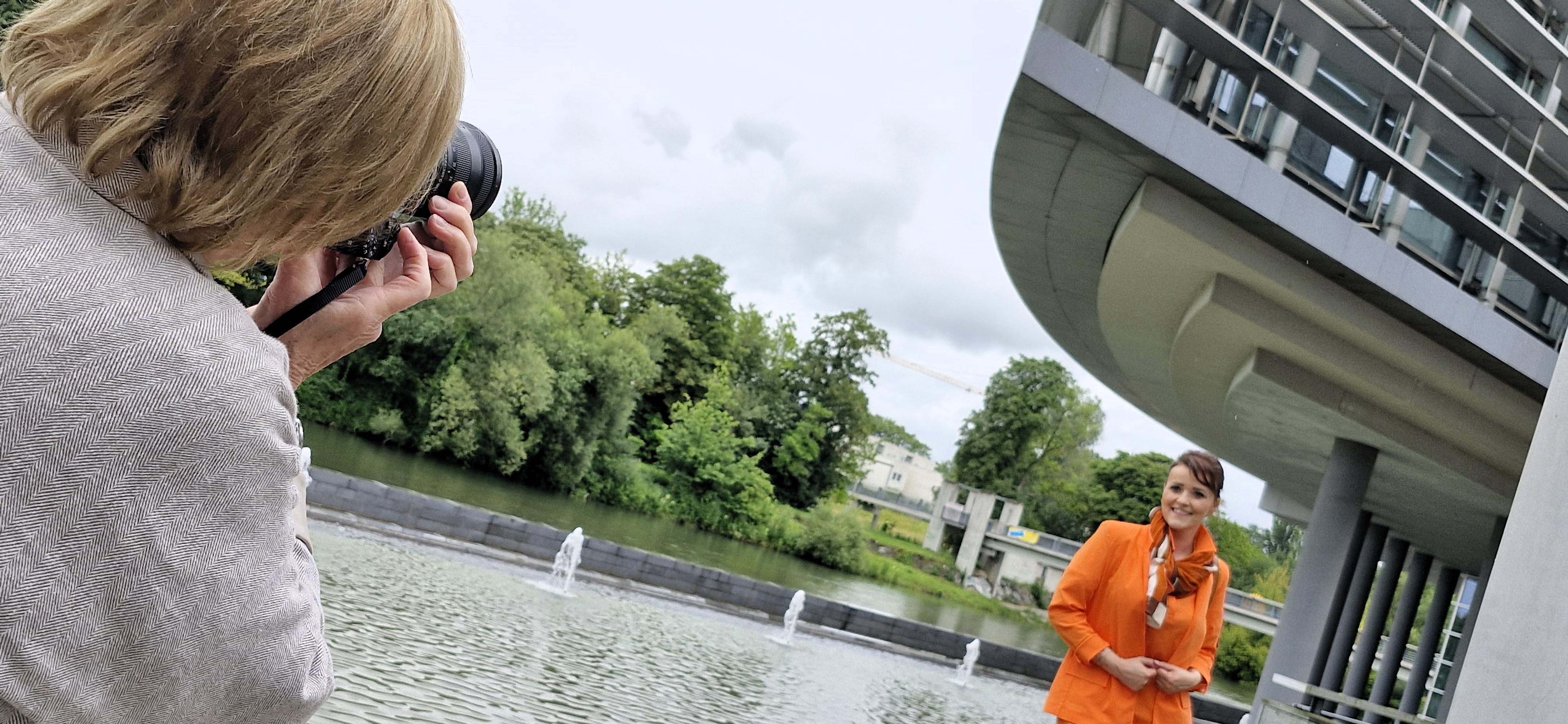 Fürs Fotoshooting wurde Jasmina von Jones eingekleidet. Jones-Lady Evelyn Humhal hatte für Jasmina ein strahlend oranges, sommerliches Ensemble gewählt, aus dem fröhlich bunten Angebot des Shops am Riemerplatz. Gerda Jaeggi vom Fotoclub ESV hat fotografiert, bei der Jones-Boutique, beim Passauer Wolf und im Regierungsviertel.