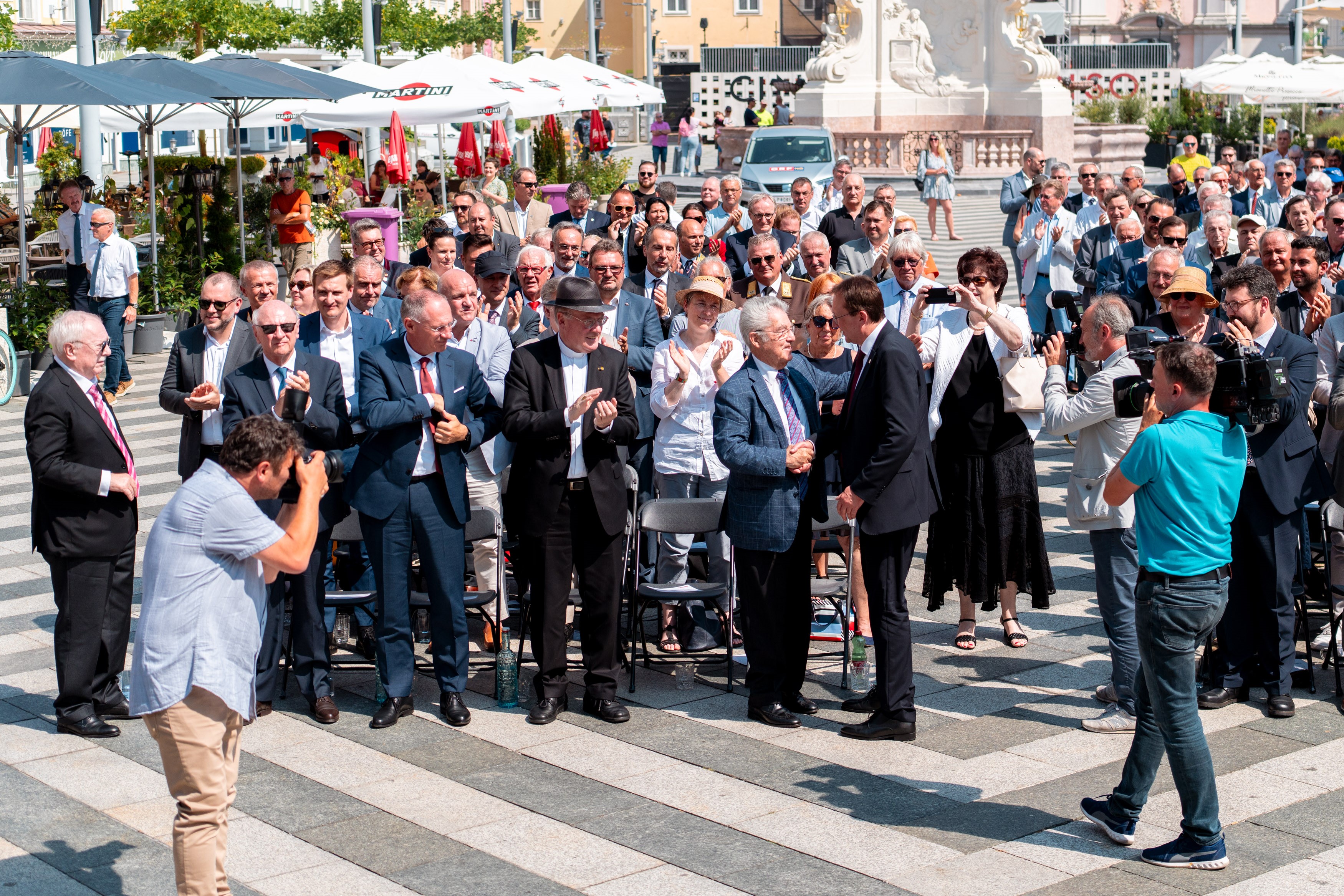Zahlreiche Wegbegleiter:innen feierten am Rathausplatz das 20. Amtsjubiläum von Bürgermeister Matthias Stadler. (Foto: Josef Bollwein)
