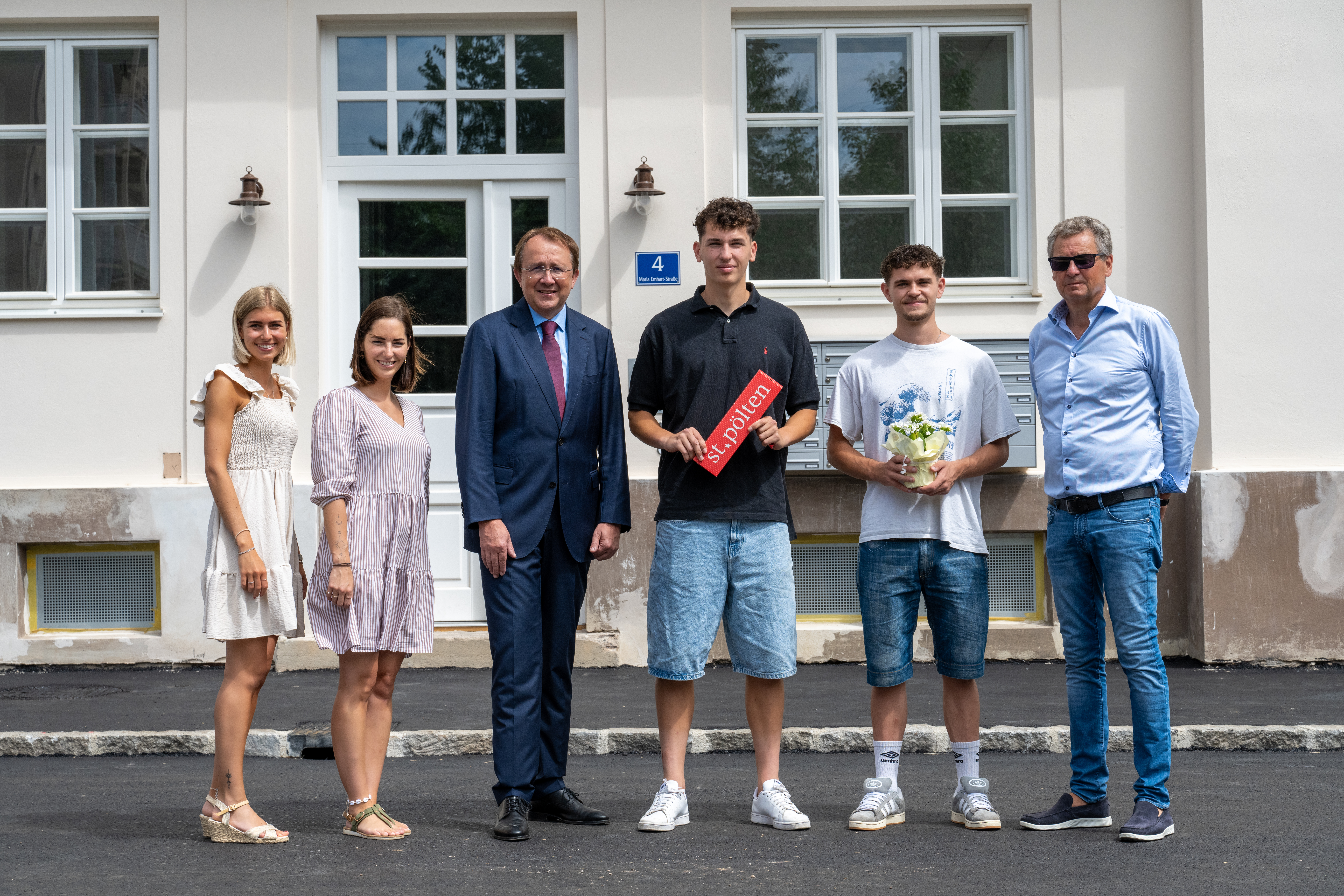 Die Mitarbeiterinnen der Immobilien St. Pölten GesmbH & Co KG übergaben gemeinsam mit Bürgermeister Matthias Stadler und dem Planer der Sanierung Roland Gronister von der gb-Projektmanagement GMBH die ersten Wohnungen in der Maria Emhart-Straße 2 – 6 an die neuen Bewohner:innen. (Foto: Gerald Weixelbraun)