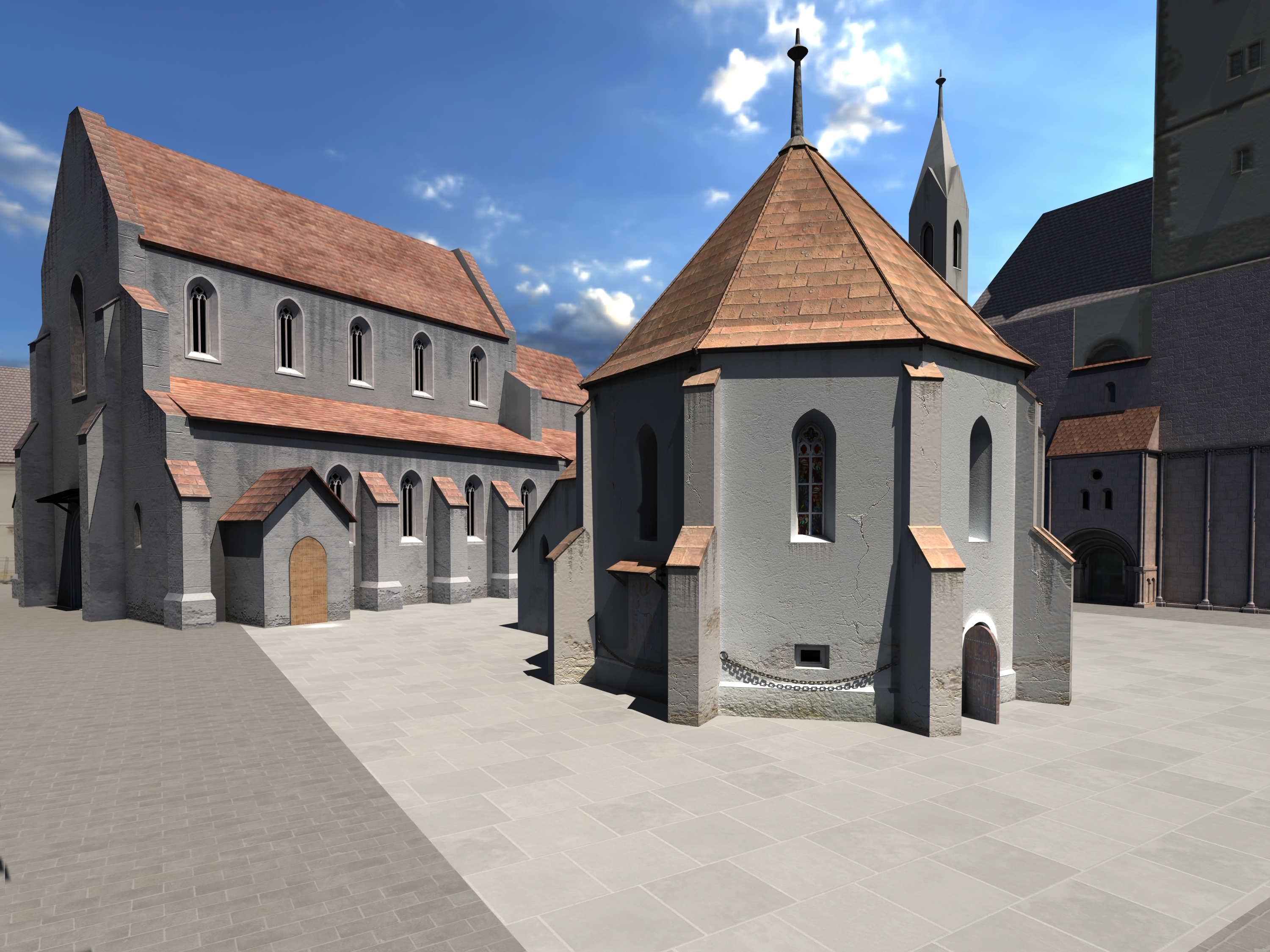 Mit dem Einsatz von sogenannten Mixed-Reality-Brillen können die Leutkirche und die Andreaskapelle am heutigen Domplatz wieder auferstehen und Besucher:innen die Gotteshäuser exakt an ihrem früheren Standort virtuell im Freien sehen und sogar betreten. Die XR-Brillen lassen die Grenzen zwischen virtueller und realer Welt verschmelzen und integrieren die Gebäude in die heutige Stadtlandschaft. So können Besucher:innen selbst in die Vergangenheit reisen und die für die Stadt über Jahrhunderte bedeutenden Bauwerke in ihrer spätmittelalterlichen und frühneuzeitlichen Gestalt von außen und innen erleben. Die beiden Kirchen prägten einst das religiöse Leben der Stadt und zeugen noch heute von der tiefen Gläubigkeit unserer Vorfahren.