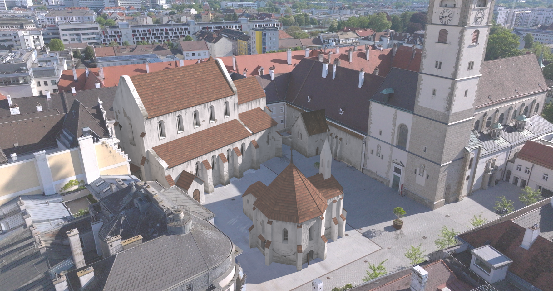 Über zehn Jahre wurde am Domplatz gegraben. Die archäologischen Forschungen brachten sensationelle Ergebnisse zutage, die in der wissenschaftlichen Community international Aufsehen erregt haben. Unter dem Boden des Domplatzes kamen mehrere Mauerfundamente zum Vorschein, die auf die Größe und Pracht zweier einstiger Gotteshäuser schließen lassen. Mit modernsten Methoden rekonstruierte Stadtarchäologe Ronald Risy sowie die renommierten Bauforscher Günther Buchinger und Paul Mitchell mit dem Medienunternehmen 7reasons auf Initiative der Kulturabteilung der Stadt mit Leiter Alfred Kellner die beiden Gebäude auf virtuelle Weise, wie sie ausgesehen haben könnten.