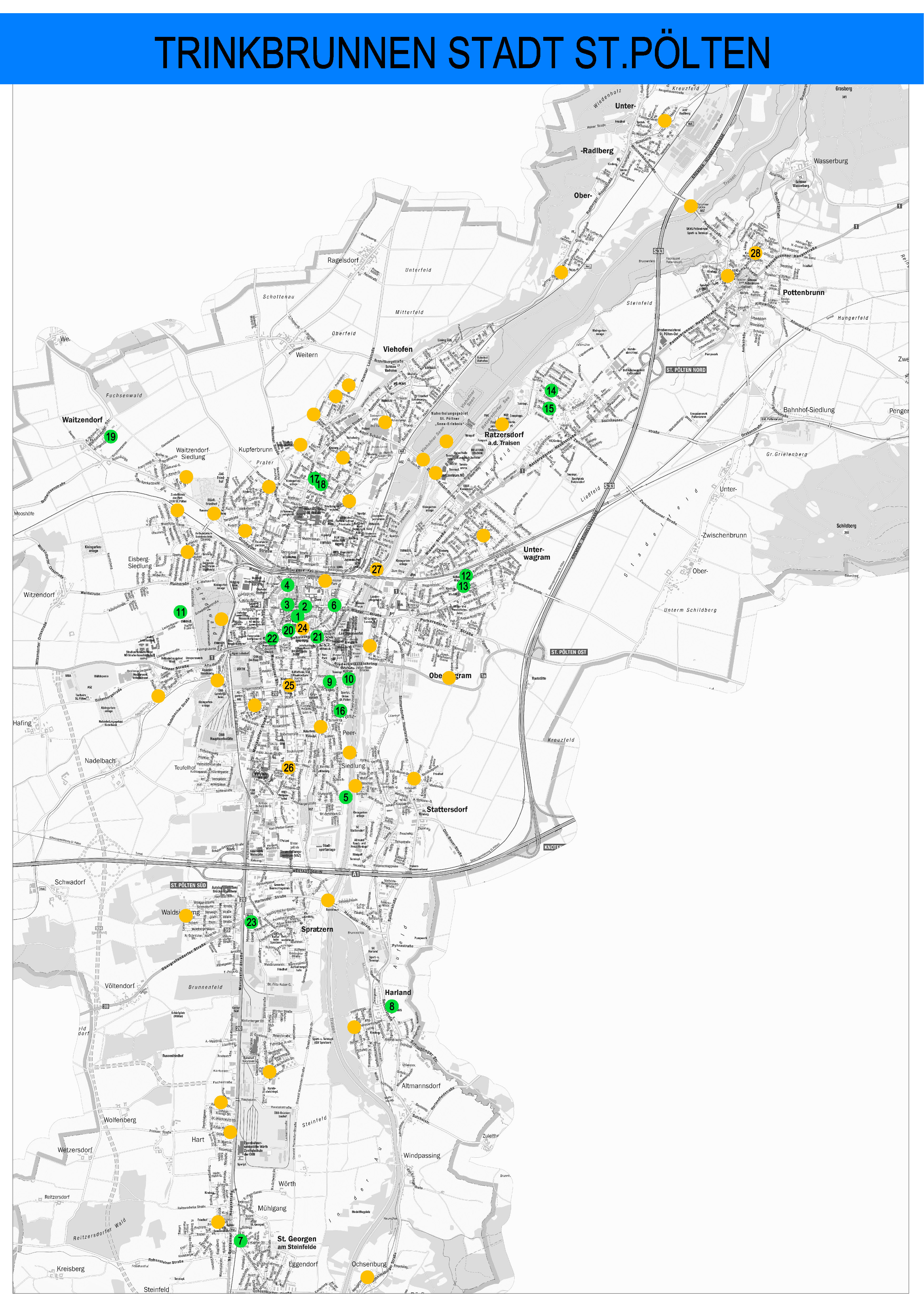 Grün: bestehende Trinkbrunnen, Gelb: geplante Trinkbrunnen / möglicher Standort