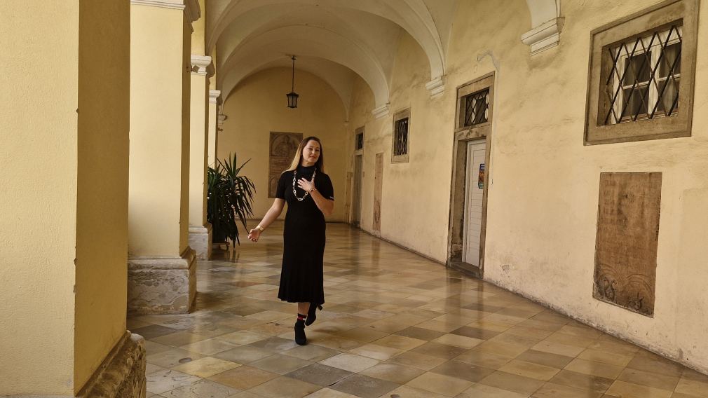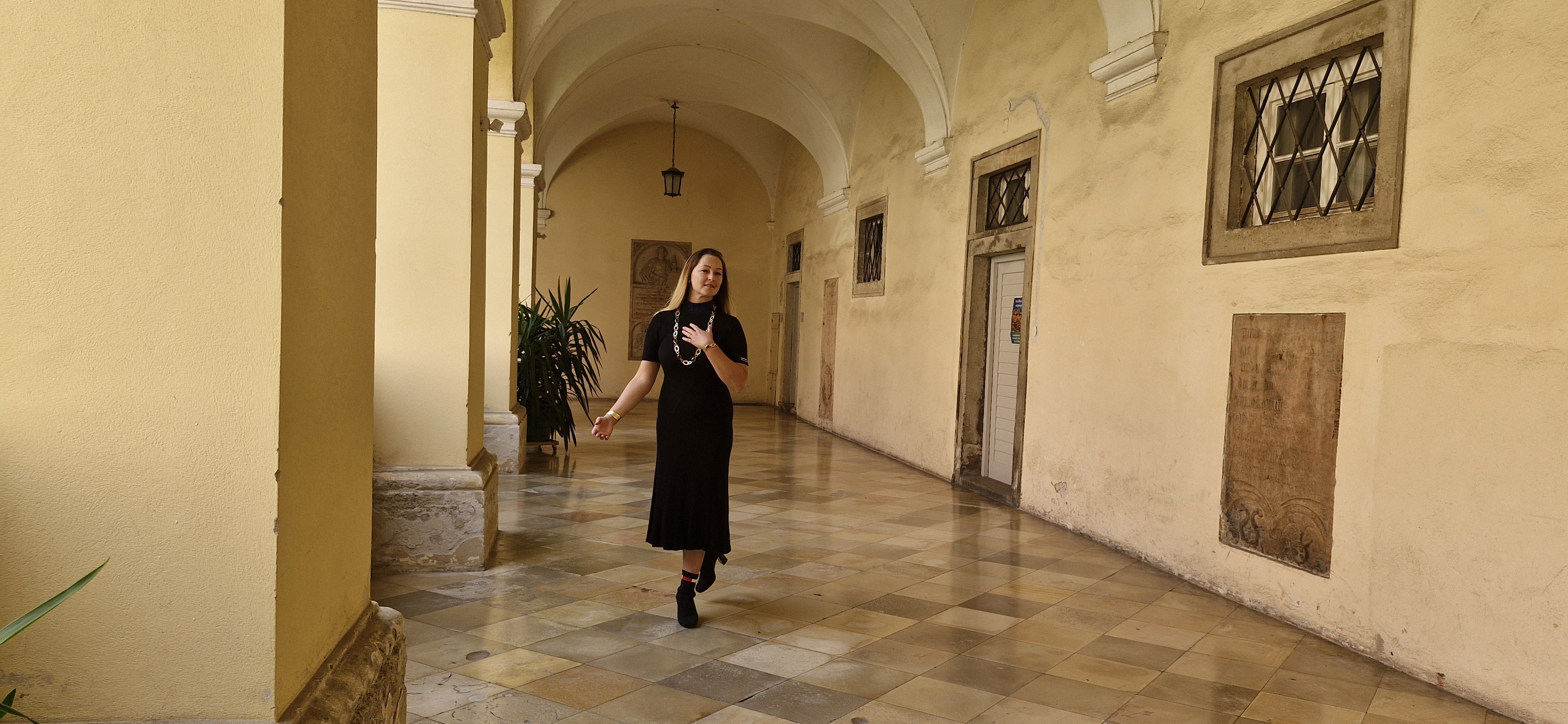 Marijana Zeisel mit eleganter Kette von Juwelier Hasenzagl im Kreuzgang des Doms. Foto: Rlebnisreich
