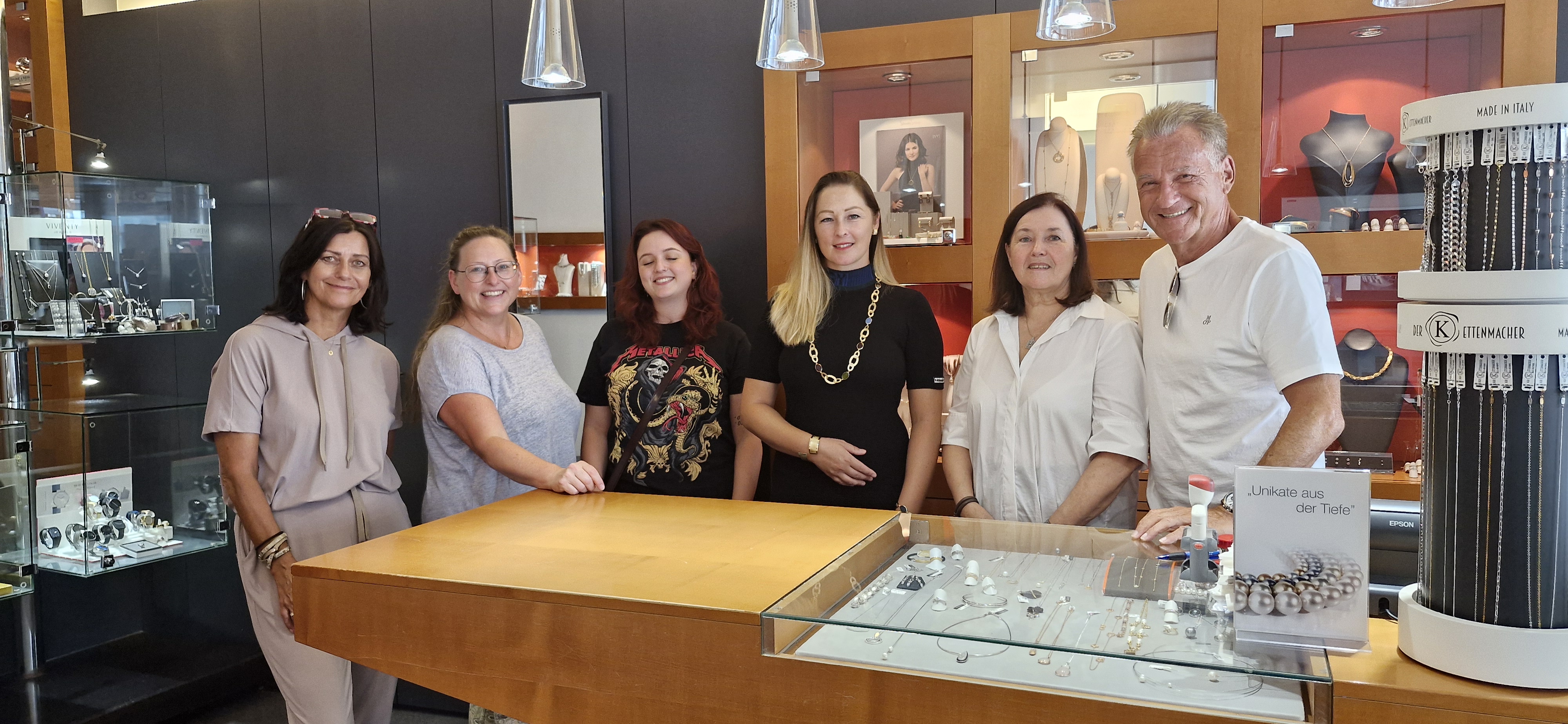 Das Kalender der Vielfalt-Team mit Marijana bei Juwelier Hasenzagl: Karin Schreylehner, Martina Eigelsreiter, Julia Höllmüller, Marijana, Christa Wohlmuth und Wolfgang Stadler.