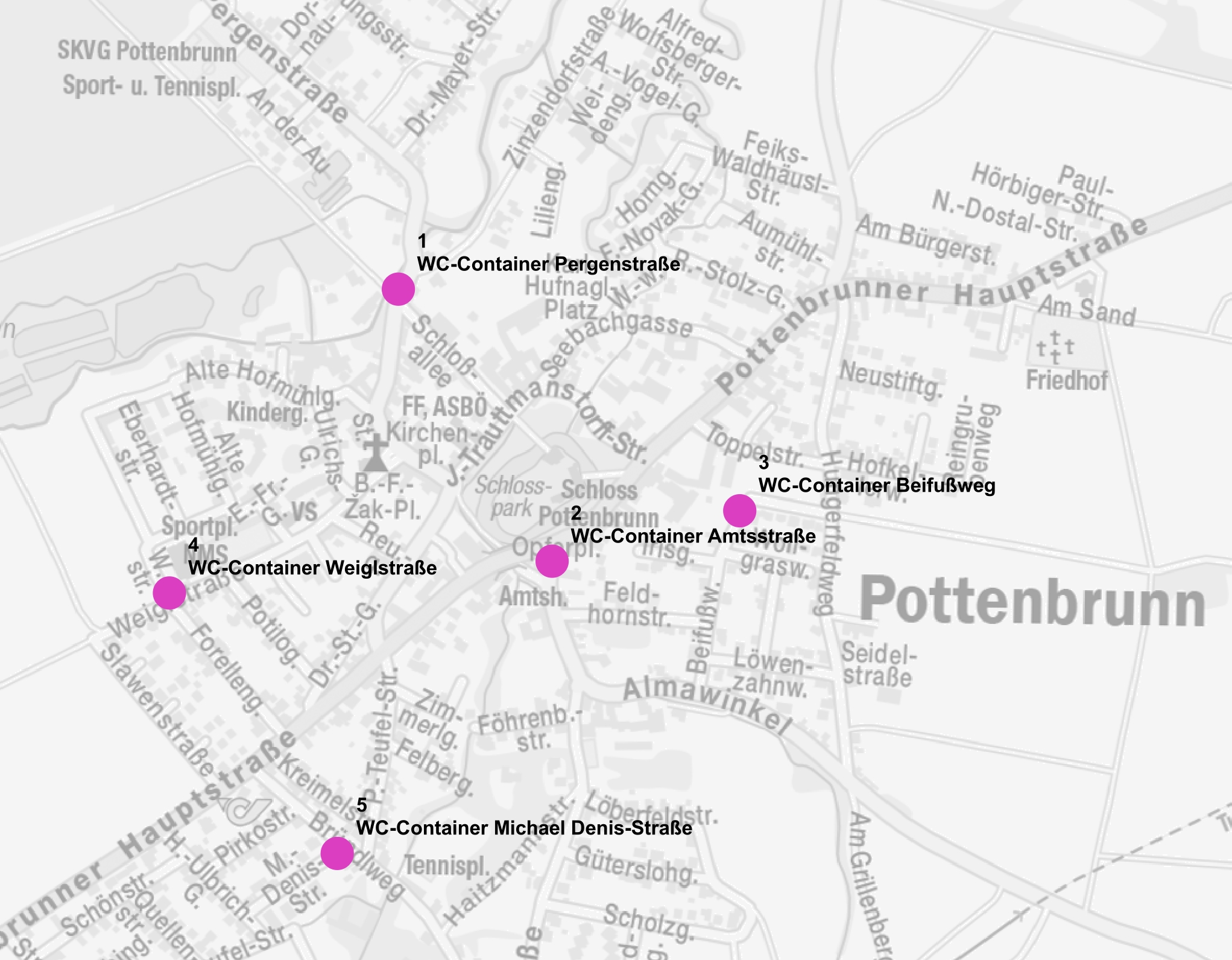- 5 WC-Containeranlagen: (Pergenstraße/Schloßallee, Amtsstraße/Opferplatz, Pflegezentrum Pottenbrunn/Beifußweg, Mittelschule Pottenbrunn/Weiglstraße, Michael Denis-Straße/ Bründlweg)