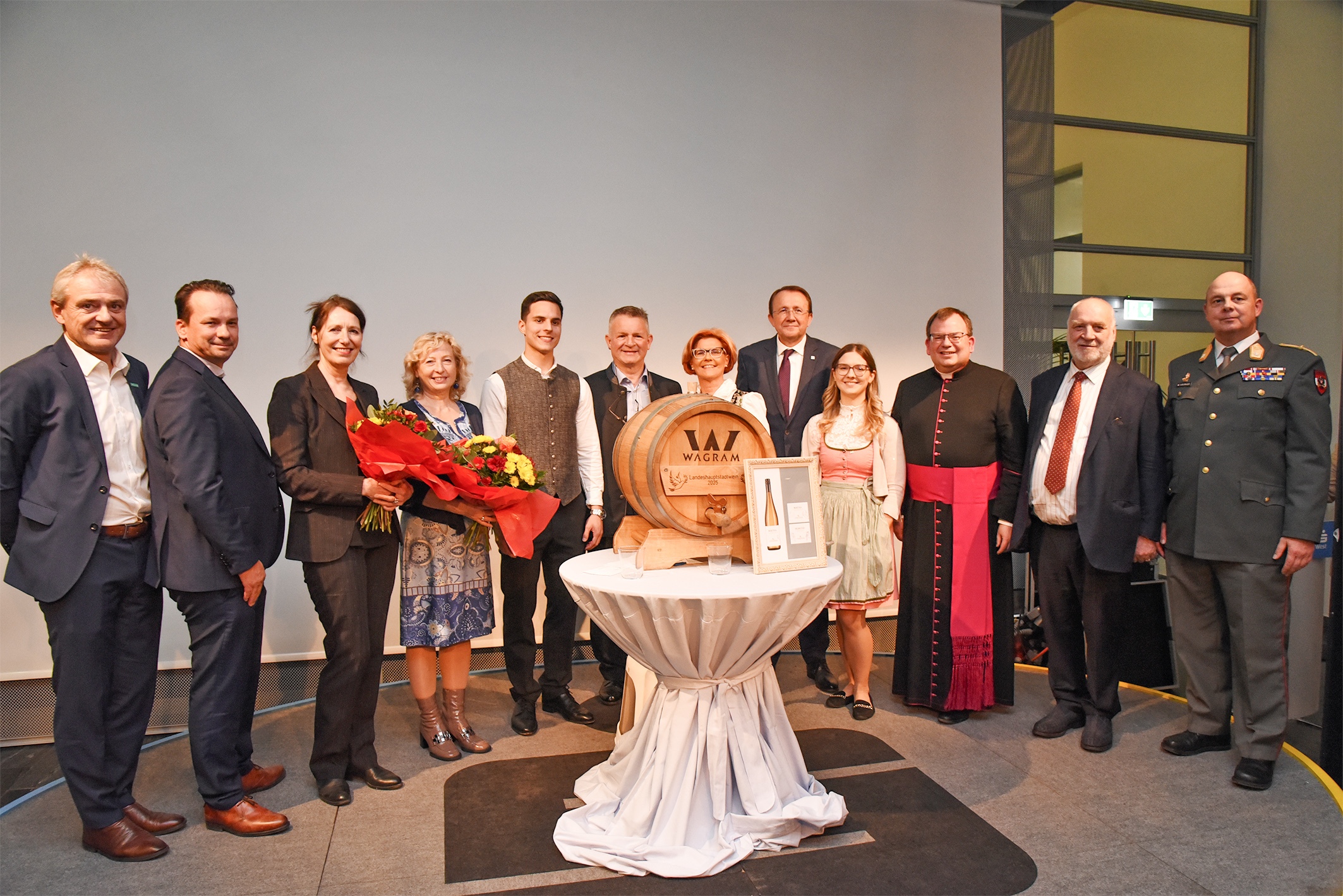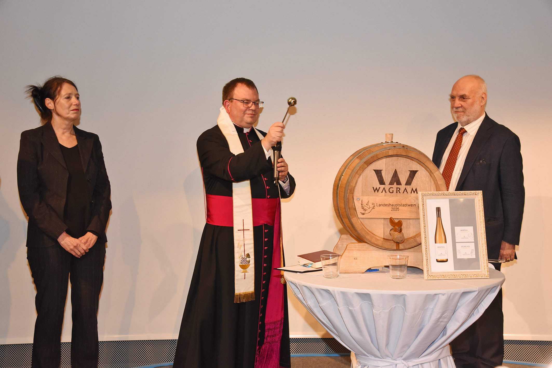 Am 12. November wurde der Hauptstadtwein 2025 im Sparkassenhaus von Ordinariatskanzler Msgr. Kan. Lic. Markus Heinz im Beisein von Bürgermeister Matthias Stadler, den Weinpat:innen, der Winzerfamilie, Sonja, Franz und Jakob Paschinger, und zahlreicher Gäste gesegnet. Die Patenschaft haben dieses Jahr die Künstlerische Leiterin des Landestheaters Niederösterreich, Marie Rötzer und der Gründer und Rektor der Sigmund-Freud-Privatuniversität, Alfred Pritz, übernommen.