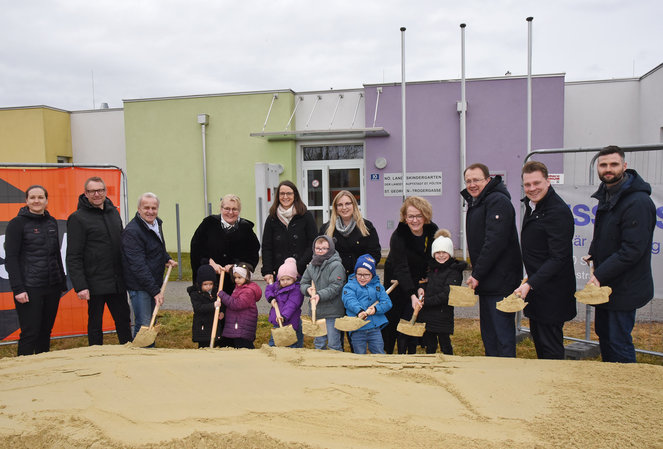 Der nächste Spatenstich erfolgte für den Kindergarten in der Trogergasse (St. Georgen) am 26. Februar. Der Kindergarten besteht zurzeit aus drei Gruppen, einem Bewegungsraum und eine über 2.000 m2 große Spielfläche im Freien. Der Kindergarten wird nun um zwei weitere Kindergartengruppen und eine Tagesbetreuungsgruppe erweitert. Die voraussichtliche Übergabe des Zubaus erfolgt im April 2026. Die Gesamtaufwendungen für das Projekt betragen 2,74 Millionen Euro.