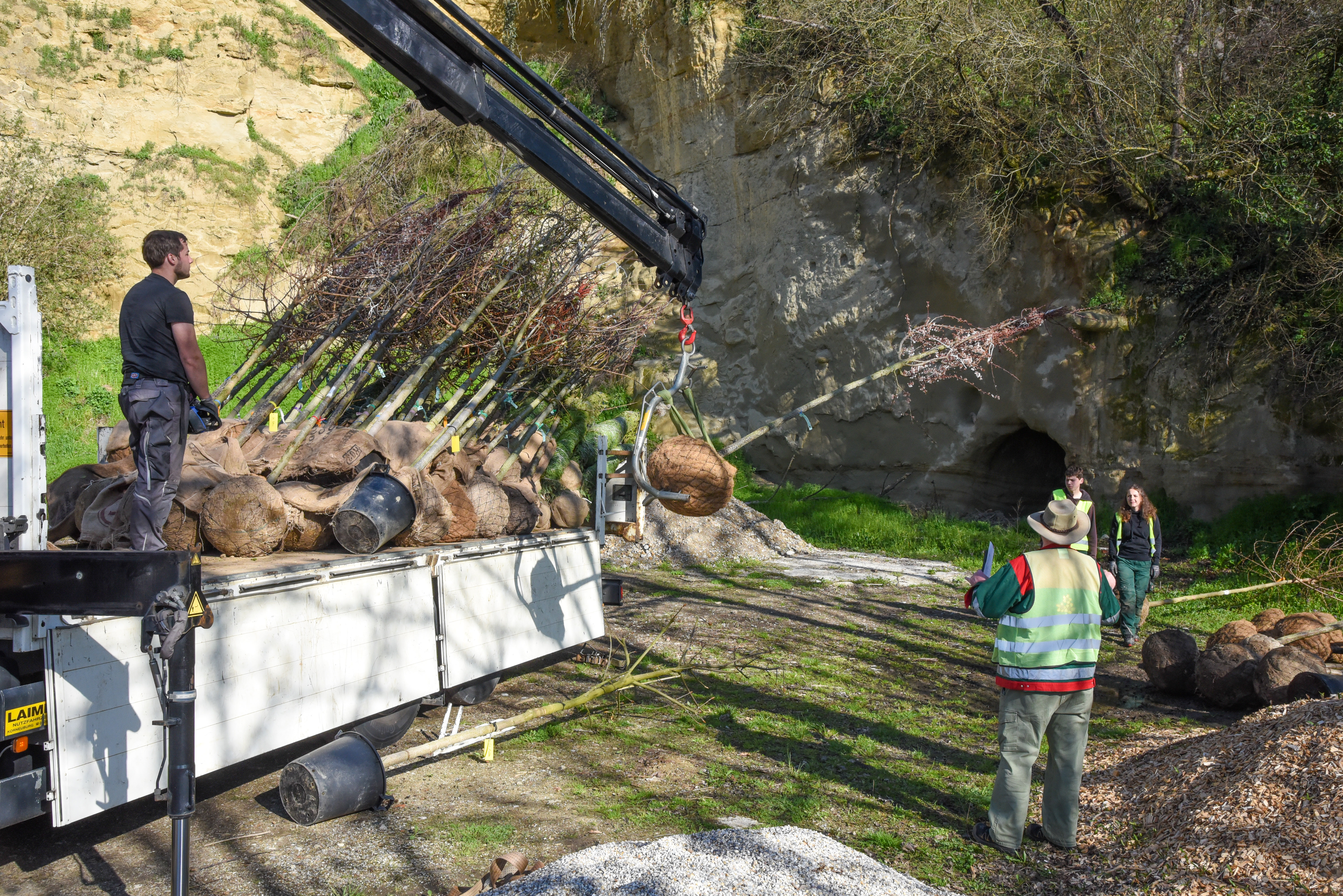 Um Stammrisse vorzubeugen, werden die jungen Bäume mit einer weißen Schutzfarbe behandelt. Diese bildet einen dehnungsfähigen Belag auf dem Stamm und schützt sie so über einen Zeitraum von vier bis fünf Jahren. Damit die Bäume bei starkem Wind nicht kippen, werden sie mit Pfählen stabilisiert. Diese sichern die jungen Pflanzen, bis sie nach etwa 3 bis 5 Jahren weit genug verwurzelt sind.