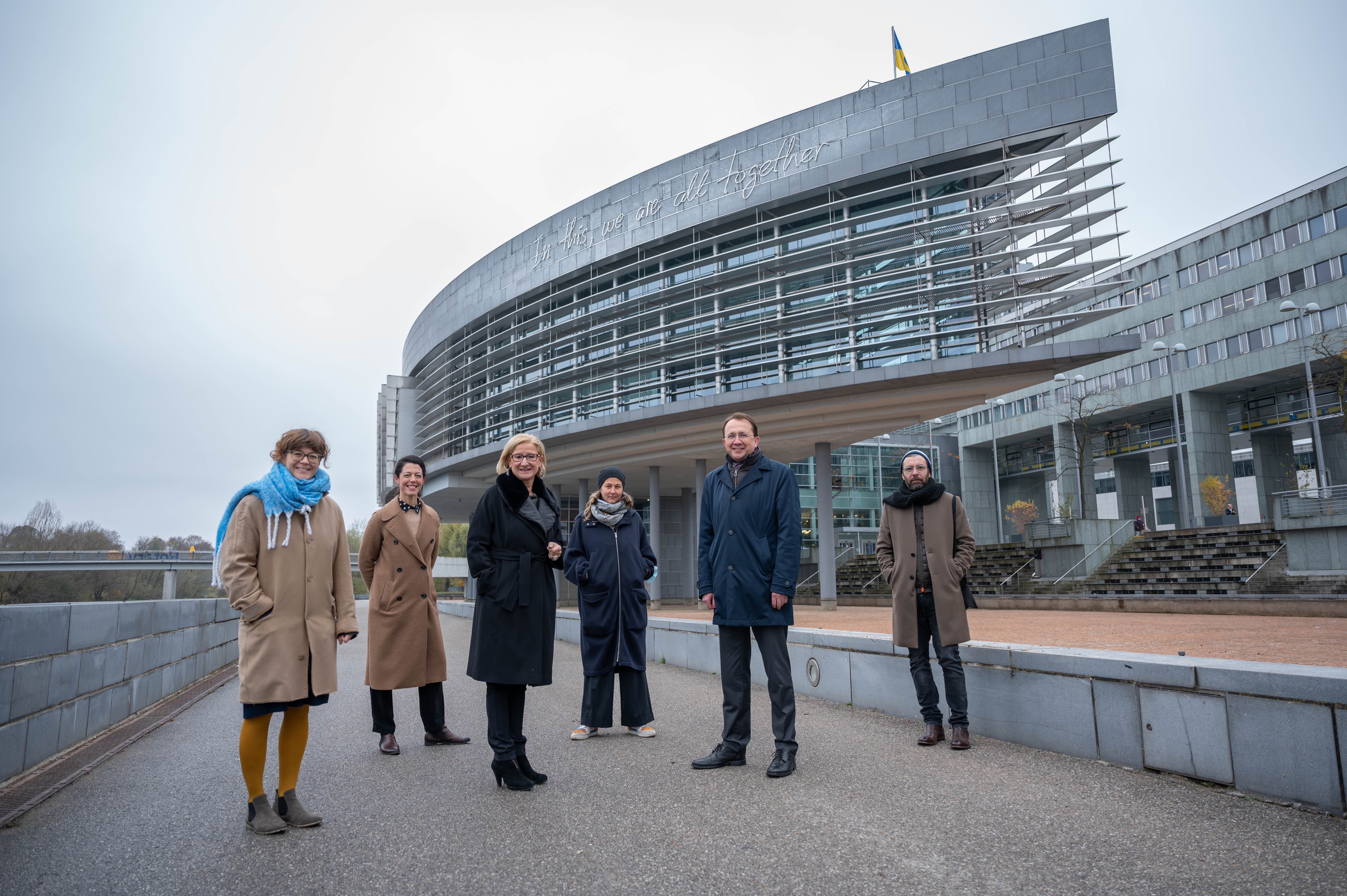 Borjana Ventzislavova (geb. 1976 in Sofia/Bulgarien, lebt und arbeitet in Wien) präsentiert bei "IN THIS TOGETHER" großformatige Schriftzüge aus Neon auf den Dächern und Fassaden von zentralen Gebäuden der Stadt: dem Bahnhof, dem Rathaus und dem Landtagsschiff. Die Lichtinstallationen sind mit der Funktion der Orte, auf denen sie montiert werden, fest verbunden – so thematisiert beispielsweise der auf dem Bahnhof angebrachte Schriftzug „Ihr Name ist Europa. Sie kam über das Meer“ die Migration als Ort, an dem sich Transit kristallisiert. In Hinblick auf ihre Kunstwerke meint Borjana Ventzislavova: „Das Friedensprojekt ist so wie auch die ganze Welt, in eine tiefe Krise geraten. Der aktuelle Pandemie-Zustand stellt die Europäische Union zunehmend in Frage. Solidarität innerhalb und gegenüber Nicht-EU BürgerInnen, Transparenz, Egalität, ein soziales, offenes und internationales Europa, sind nur einige der Gedanken, die mich bei den Überlegungen für dieses Projekt begleitet haben.“