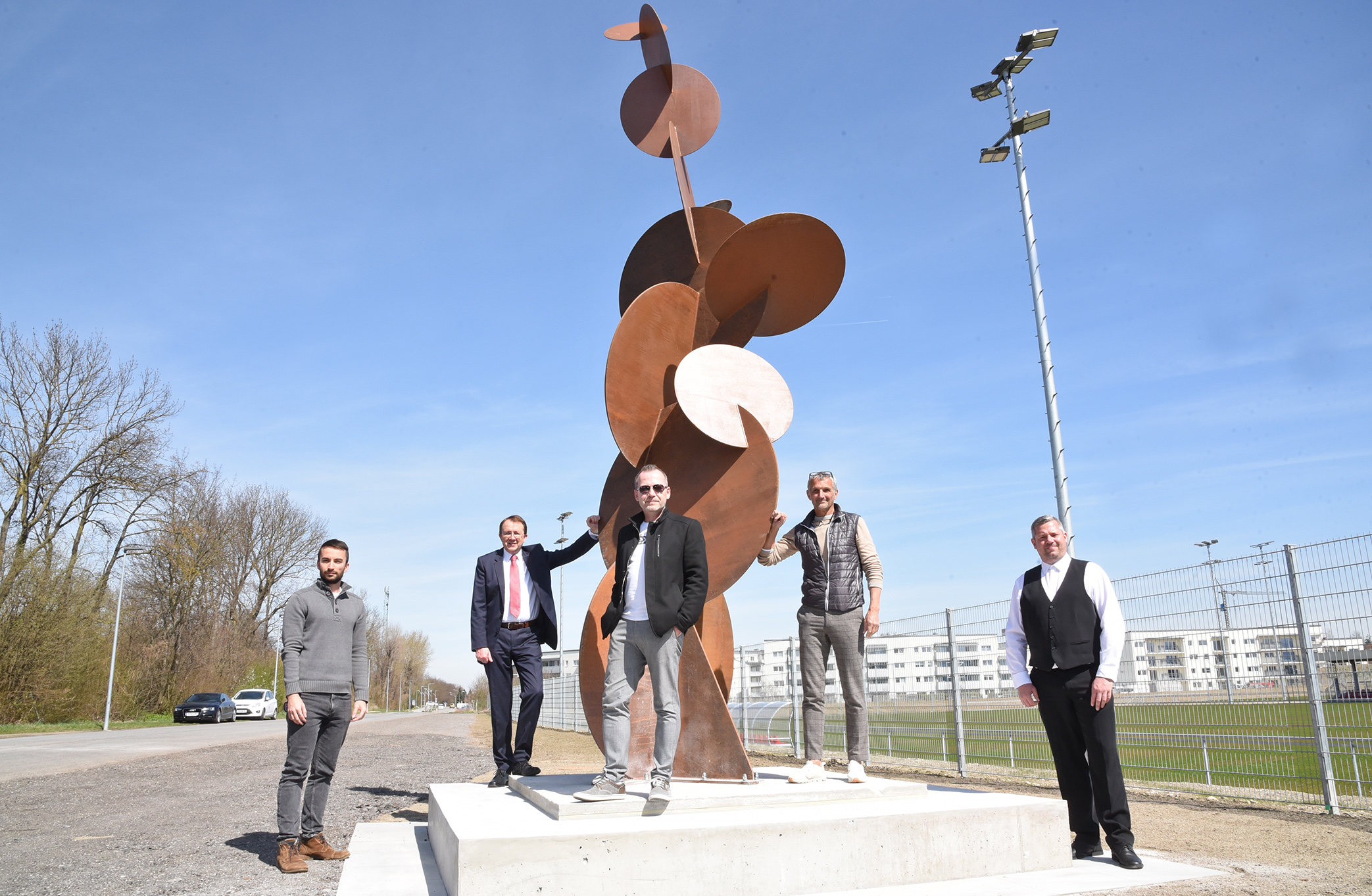 Um dieses Zusammenspiel auch visuell zu verankern, wurde eine mehrere Meter große Skulptur bei der Stadtsportanlage im Süden St. Pöltens installiert. Der Künstler Andreas Herfert erklärt: "Die Skulptur steht für elf Spieler, elf Individualisten, elf verschiedene Talente aber ein Team. So wie die Scheiben als Bälle gesehen werden können, so stellen sie auch die elf verschiedenen Persönlichkeiten, Charaktere und Talente dar, die notwendig sind, um ein Team zu bilden. Ein Team mit einem Ziel - dem Weg nach oben."