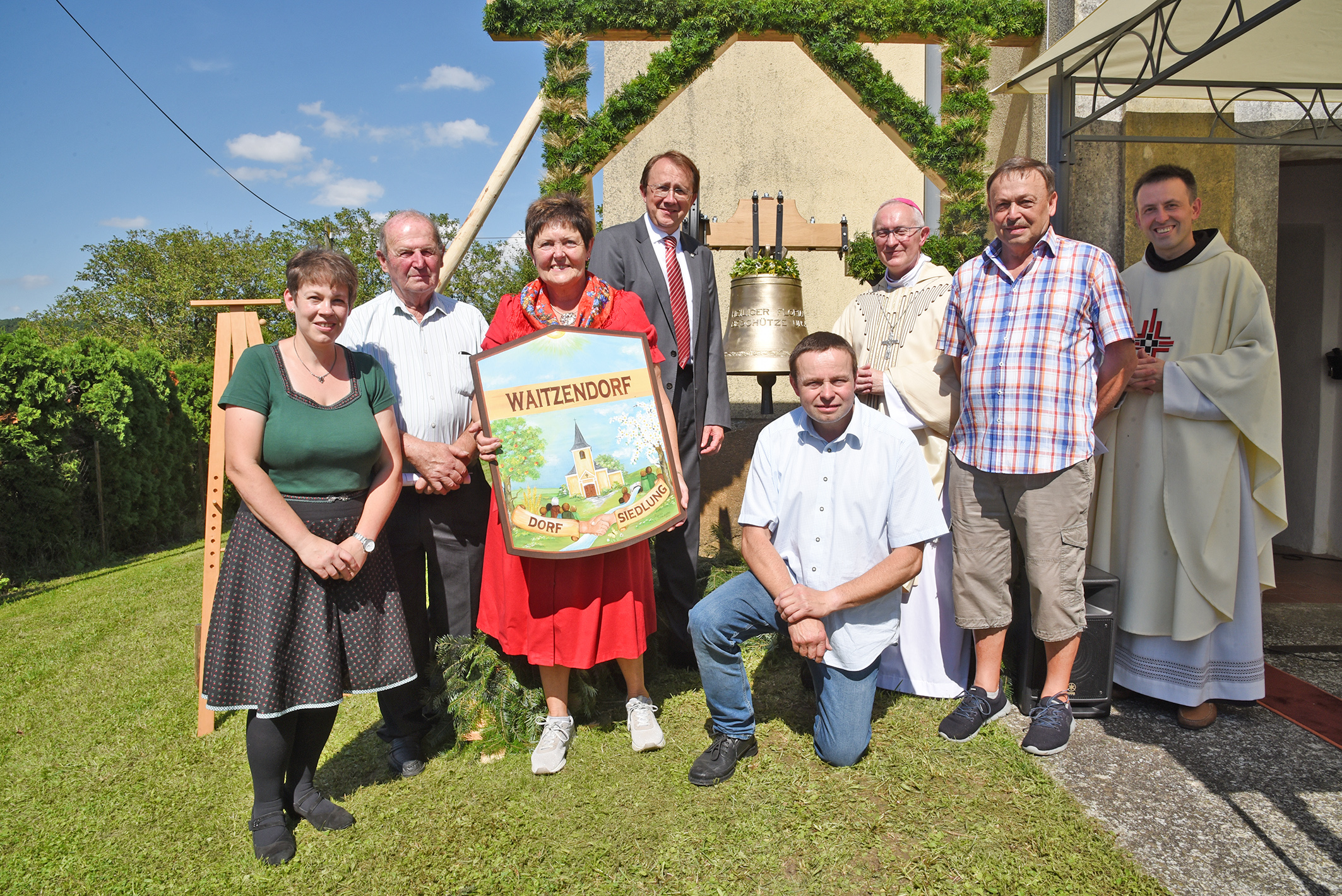Sowohl für die Waitzendorfer Ortsgemeinschaft als auch für Weihbischof Dr. Anton Leichtfried war es die erste Glockenweihe. Die alte Glocke stammte aus dem Jahr 1916 und musste aufgrund eines festgestellten Schadens ausgetauscht werden. Dr. Anton Leichtfried und der Pfarrer der Franziskanerkirche, Pater Lucjan Hozer, zelebrierten den Festgottesdienst mit der Ortsgemeinschaft im Beisein von Bürgermeister Mag. Matthias Stadler. Unter der Leitung der Familie Thürauer wurde die Heilige Messe von Waitzendorfer Streicher- und Gesangsensembles musikalisch gestaltet. In seiner abwechslungsreichen Predigt ermutigte der Weihbischof die Anwesenden, das Läuten der Glocke zum Anlass zu nehmen, innezuhalten.