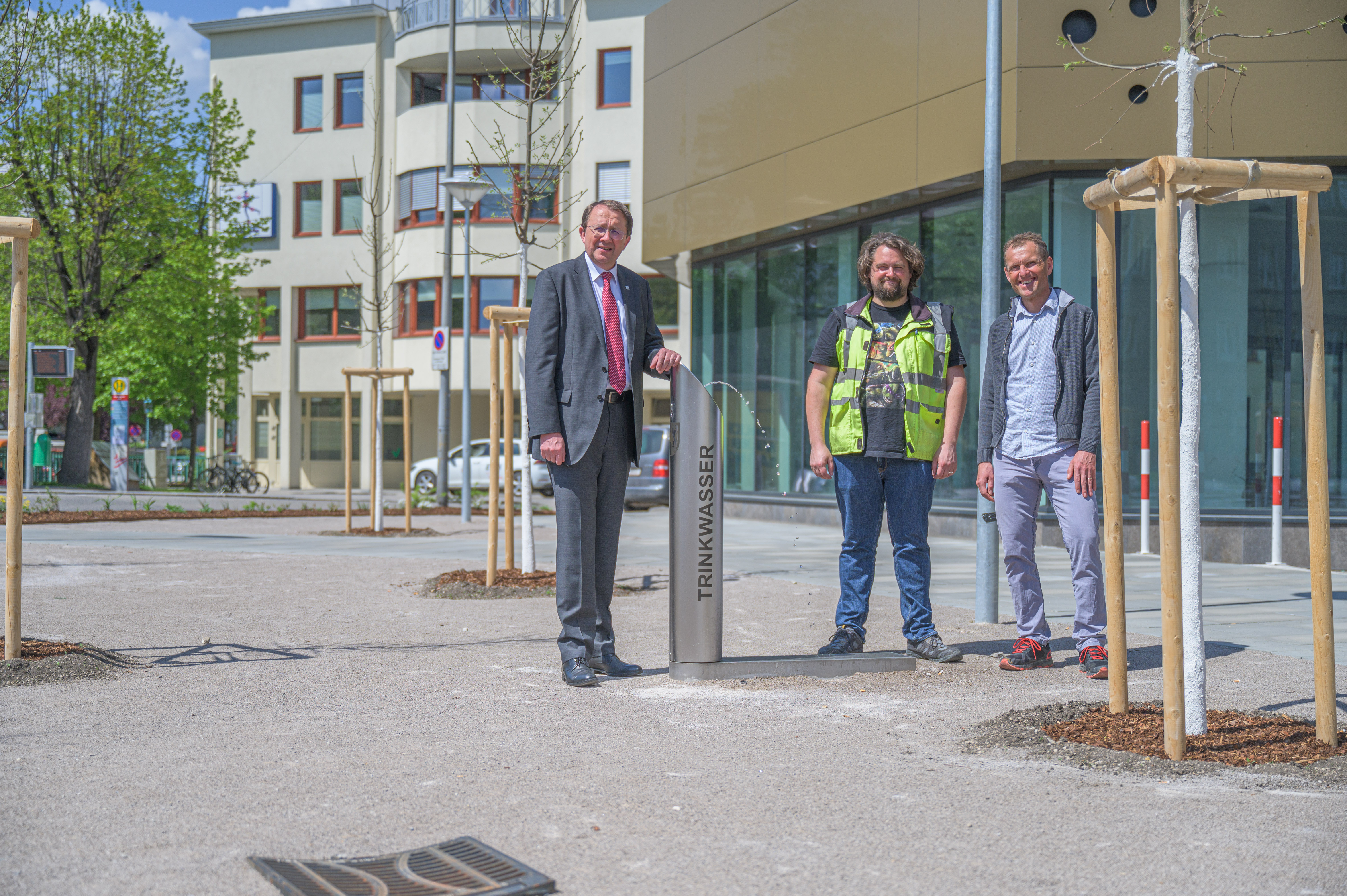 Fassadenseitig wurde ein 3,5 Meter breiter Gehweg und Straßenseitig ein drei Meter breiter Radweg errichtet. Für eine kühle Atmosphäre sorgen 13 neugepflanzte Bäume und ein Trinkbrunnen. Damit nicht der gesamte Platz versiegelt wird, wurde die Fläche zwischen den Pflasterwegen mittels einer wassergebundenen Decke, welche versickerungsfähig ist, befestigt.