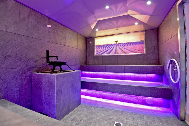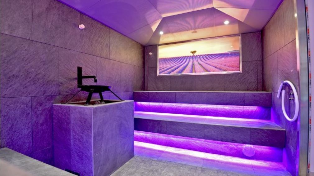 Das Dampfbad verfügt über sieben Sitzplätze. Besonders sind die „niedrigen“ Temperaturen von 40°C bis 45°C und die relative Luftfeuchtigkeit von 100 % .Der entstehende