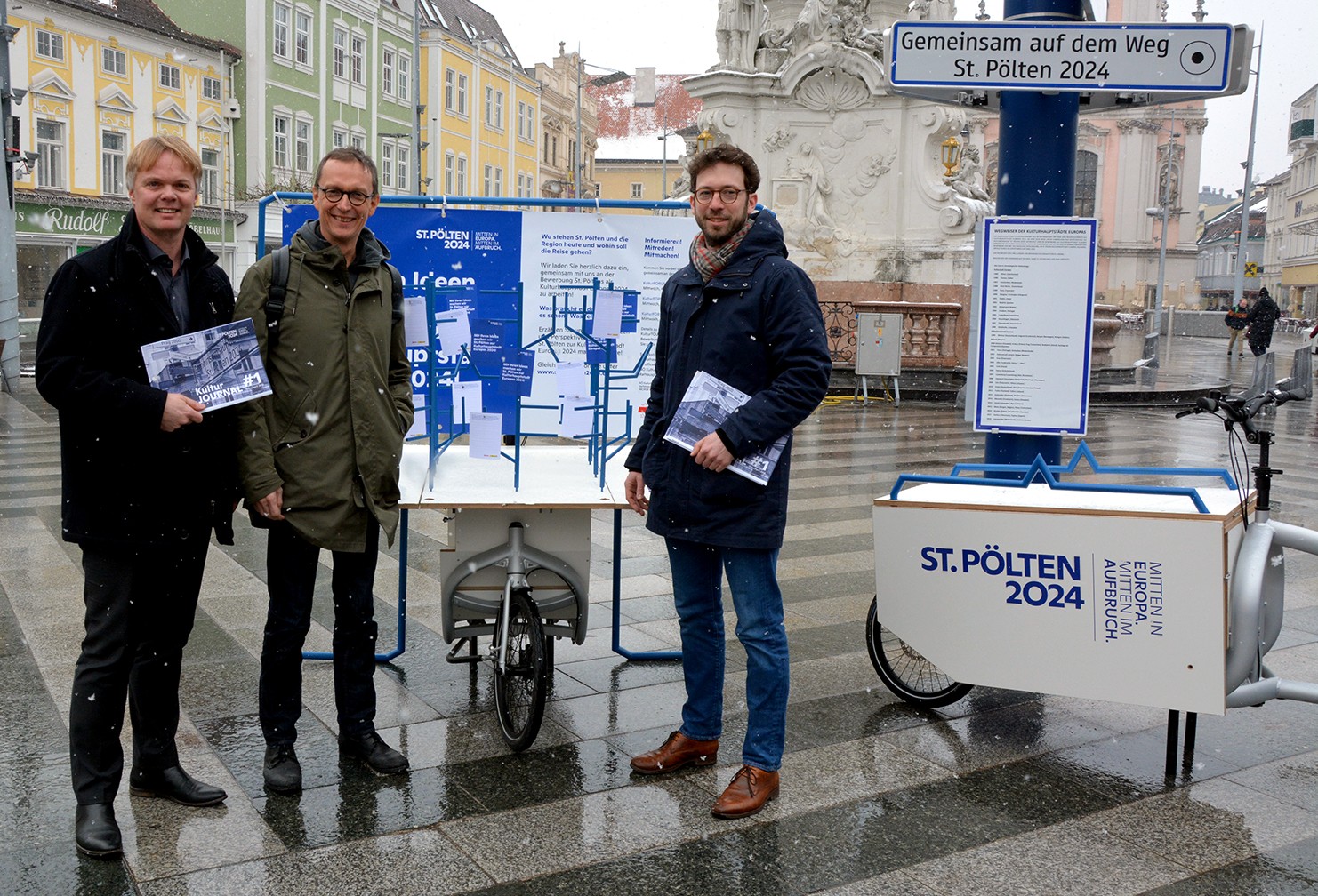 Michael Duscher, Rudolf Scheuvens und Jakob Redl präsentieren die Kultur-Räder als mobile Infostände, die ab sofort in der Stadt unterwegs sind.